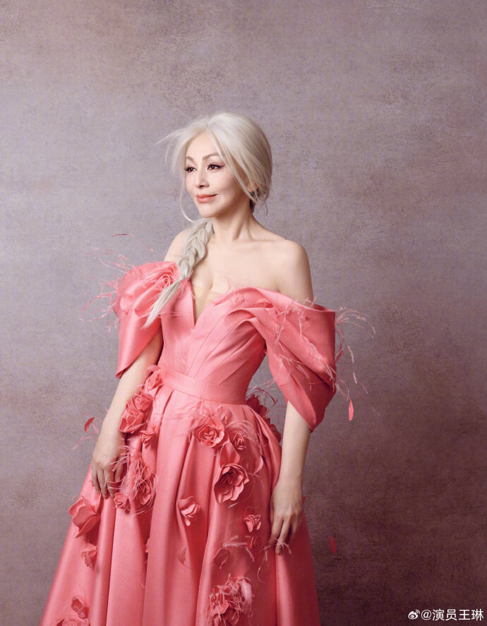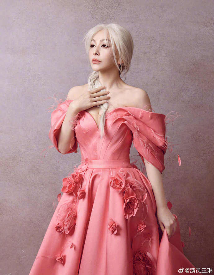 照片中,她以一头银白长发搭配蓬松长辫,温柔中带着飒爽气场,完全颠覆了大众对她的经典印象。一袭深V粉色缎面礼服裙格外吸睛,立体玫瑰刺绣点缀裙身,露肩泡泡袖设计更添浪漫氛围,将优雅与妩媚完美融合。她或叉腰浅笑,或轻提裙摆,在复古背景下尽显成熟女性的魅力,温柔又有力量。