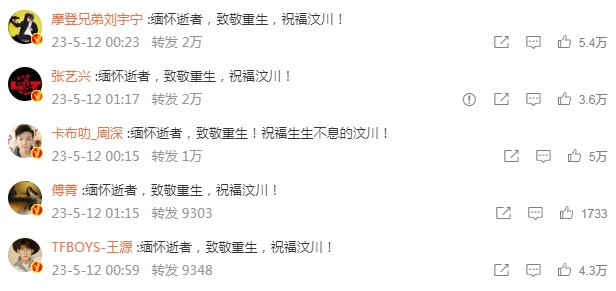 May 12 is the 15th anniversary of the Wenchuan earthquake. In 2008, a magnitude 8.0 earthquake occurred in Wenchuan, Sichuan, killing nearly 70, 000 people, 18000 missing and more than 370000 injured. Stars post messages on Weibo in memory of their lost compatriots and pay tribute to their rebirth.