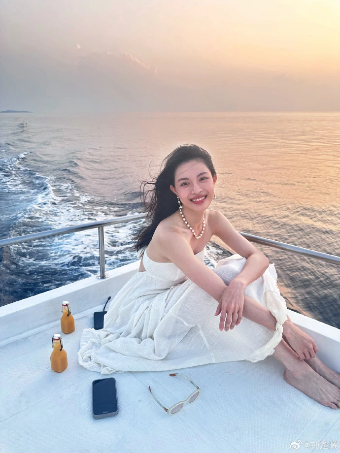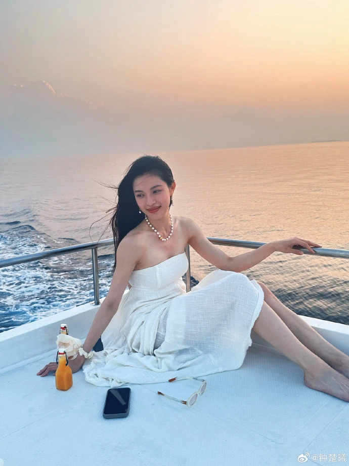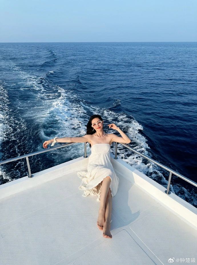 In the photo, Zhong Chuxi is wearing a simple white tube top dress with a pearl necklace. Her long hair is flying wantonly in the sea breeze. Sometimes she sits on the deck of the yacht and smiles barefoot, and sometimes she gets up and stretches against the waves. The orange sunset dyed the sea halo into a gentle gradient. Her figure blended with the sea and sky, and her movements were full of freedom and stretch. In another group photo, Zhong Chuxi and her best friend are in the same frame. The two of them are wearing personalized sunglasses and smiling brightly in front of the surging waves, showing the freedom and friendship between their best friends.