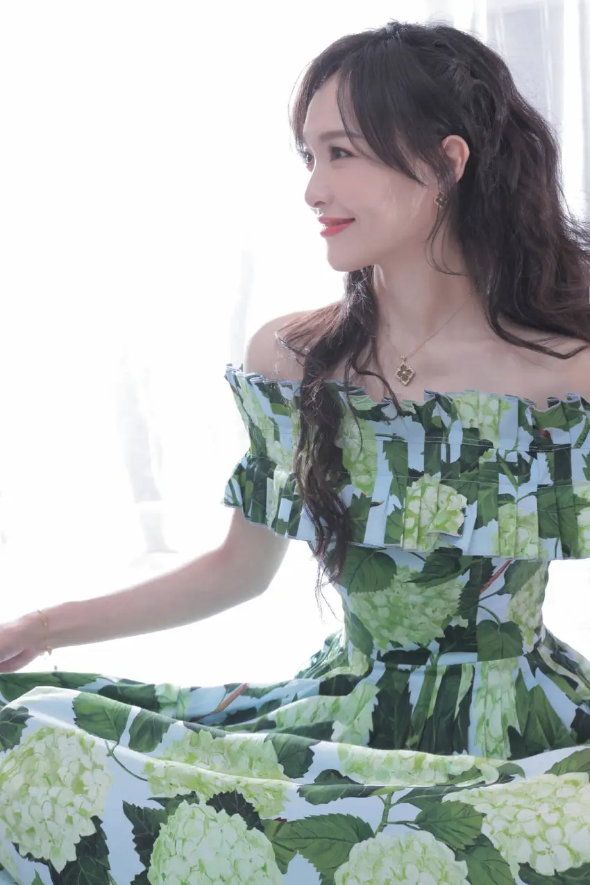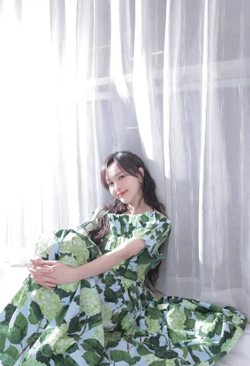 On March 9, Tang Yan posted a group of beautiful photos of activities. Tang Yan in the photo is dressed in a green broken flower dress with fragrant shoulders.