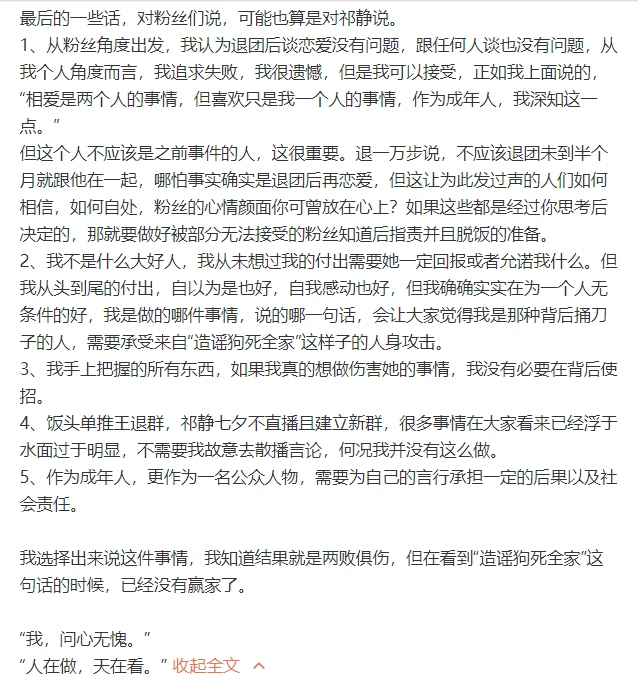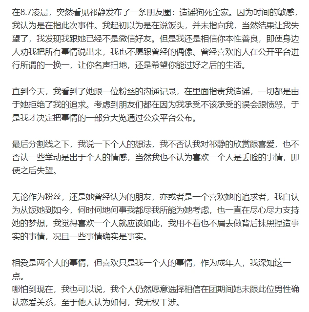 In the early morning of the 10th, Qi Jing fan @ pomelo Pomeloer, a former member of SNH48, posted a long message on Weibo, saying that after learning that Qi Jing had the idea of quitting the group, Qi Jing was introduced to his friend's company to sign a contract, and the company helped Qi Jing pay SNH48 liquidated damages, personally transferred to Qi Jing 50% SNH48 liquidated damages, etc., but found that Qi Jing fell in love in the process of cooperation, so he took off the powder, but Qijing insinuated that "rumor-mongering dog killed the whole family" by Qi Jing, and Wechat was deleted by the woman. At the same time, when chatting with other fans, he accused him of spreading rumors, all because Qi Jing rejected his pursuit.