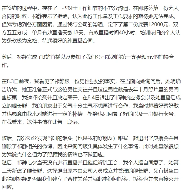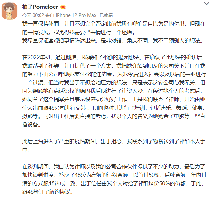 In the early morning of the 10th, Qi Jing fan @ pomelo Pomeloer, a former member of SNH48, revealed in a long post on Weibo that after learning that Qi Jing had the idea of quitting the group, he introduced Qi Jing to his friend's company to sign the contract, and the company helped Qi Jing pay SNH48's liquidated damages, which was personally transferred to Qi Jing's 50% SN.