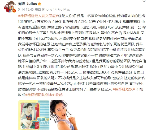 In the early morning of the 18th, Liu Weiwen denied that he was hot: "am I also an audience?" I can't dance yet? What you are watching is an editing program "riding the Wind", while what I see is Xu Huaiyu's debut life. " Earlier, Xu Huaiyu was accused of paddling on the stage. Liu Wei said Xu Huaiyu was not confident and shouted to Xu Huaiyu's agent.