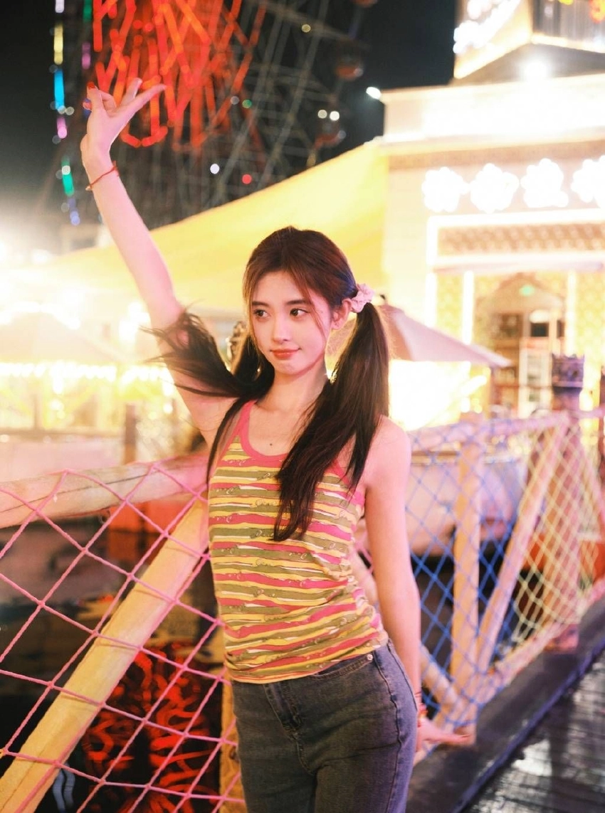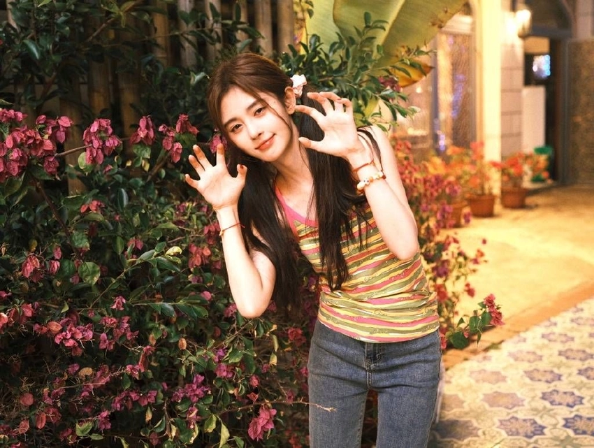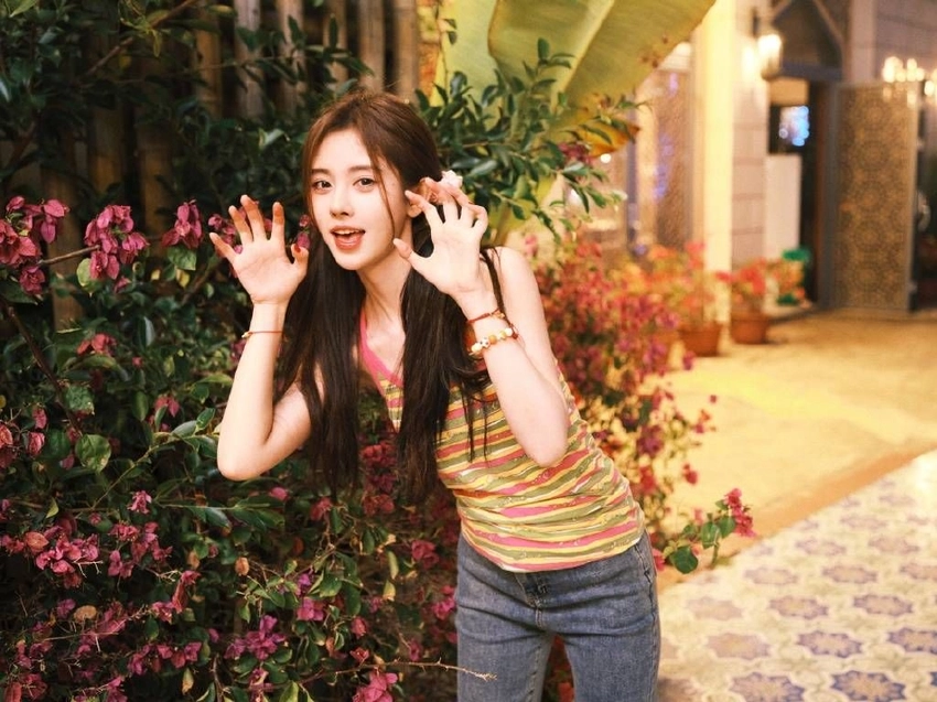 On the 5th, Ju's studio posted a set of stock photos of visiting Thailand, showing Ju wearing a colored striped vest and smiling with her cheeks in her hands, acting cute and cute toward the camera.