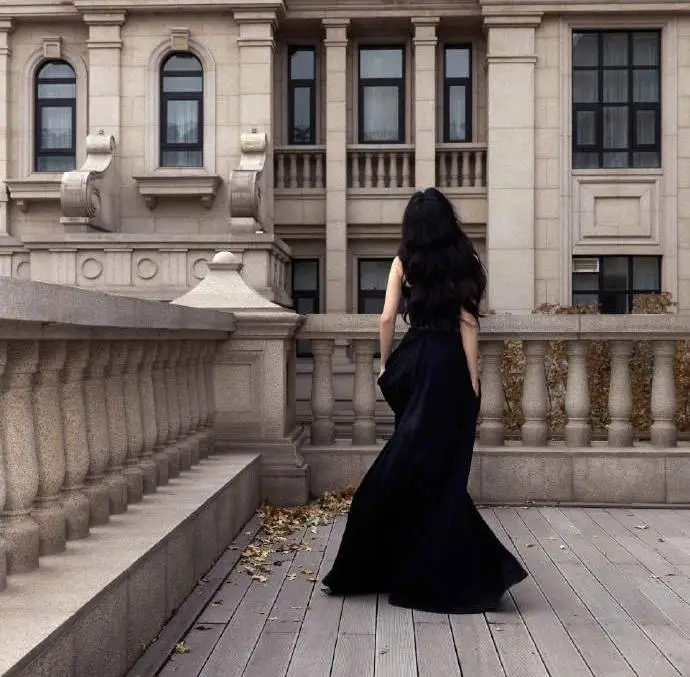 Zhang Li wore a black dress with chest slit and slit to show off her outstanding temperament on the rooftop with long legs.