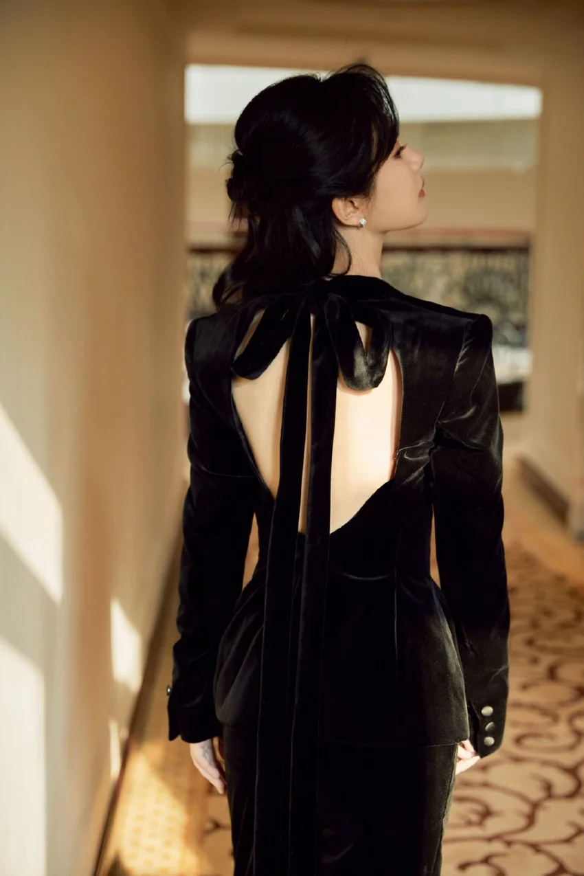 The beauty overlord has a fixed view! Yang Zi is elegant and sexy in a black velvet bareback suit.