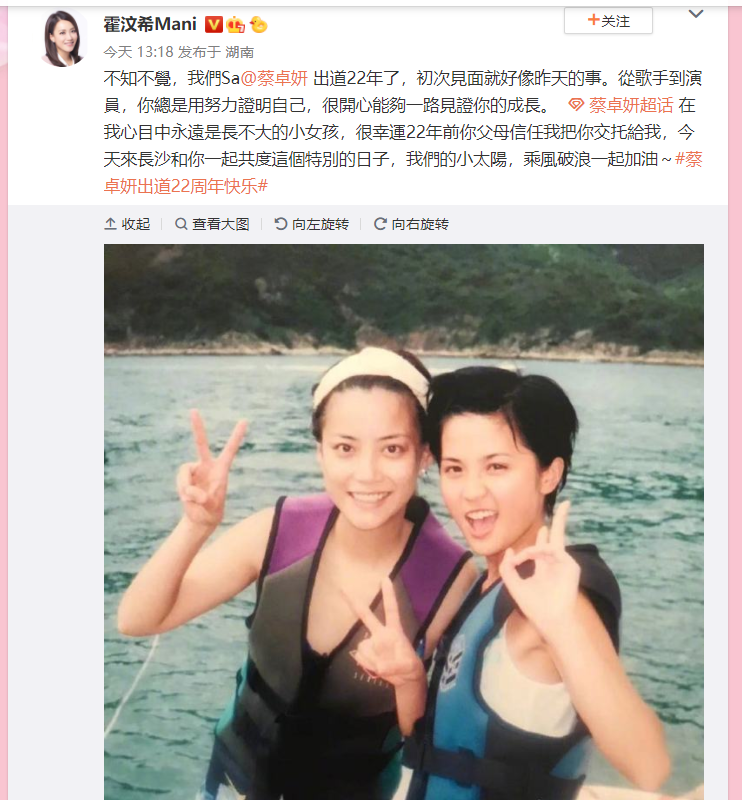 On August 1st, Huo Wenxi posted a message to commemorate the 22nd anniversary of Cai Zhuoyan Asa's debut: "unwittingly, our Sa@ Cai Zhuoyan has been making her debut for 22 years, and the first meeting is like yesterday." From singer to actor, you always try to prove yourself, and you are happy to witness your growth all the way. "