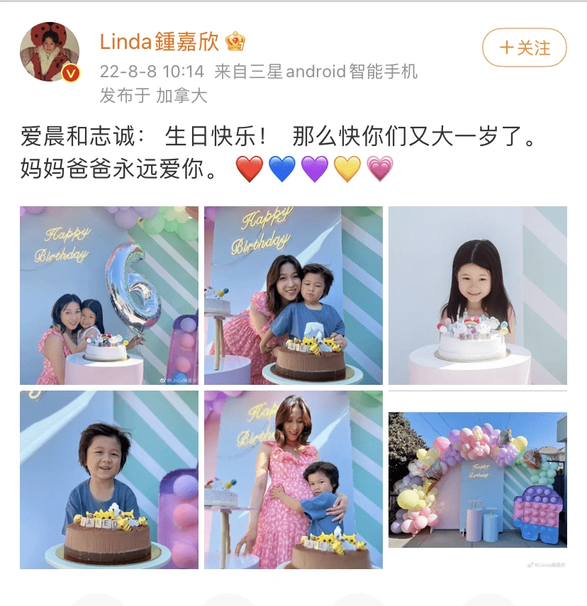 On the 8th, Zhong Jiaxin posted a group of birthday photos for the children with the words: "Happy Birthday to Aichen and Zhicheng!" Mom and dad will always love you. "