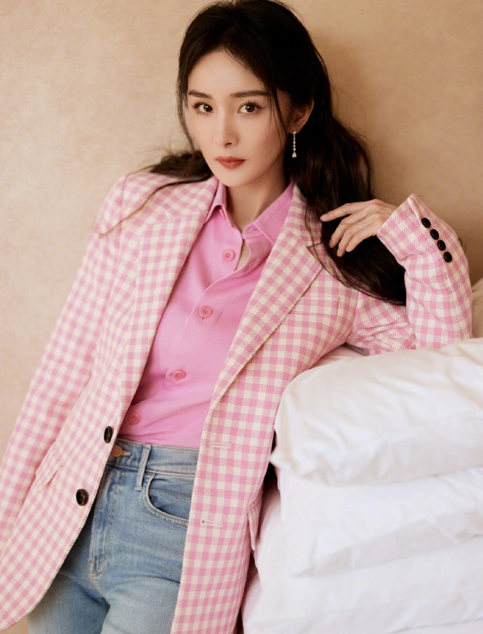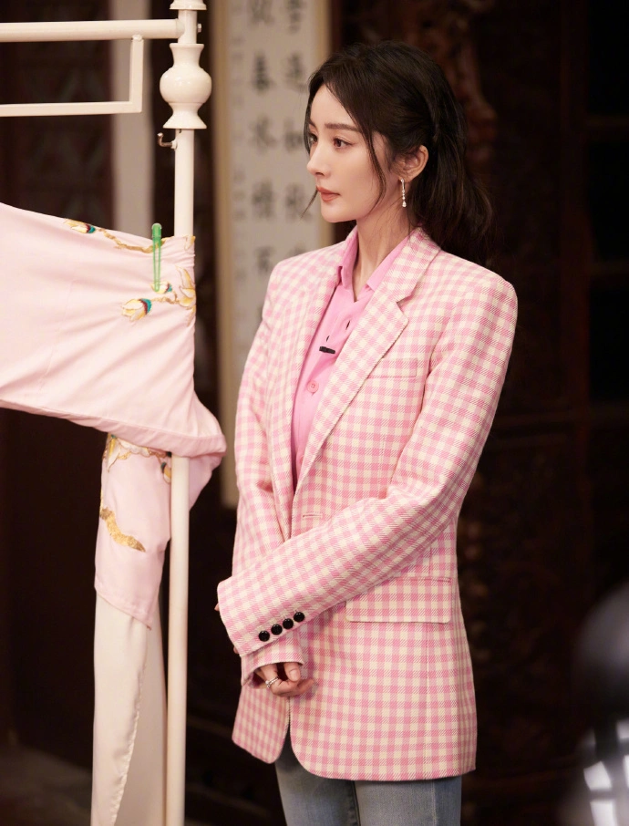 Yang Mi's pink plaid suit is pure and beautiful and shows off a beautiful figure.