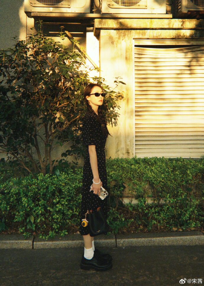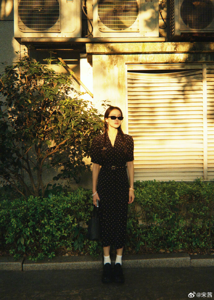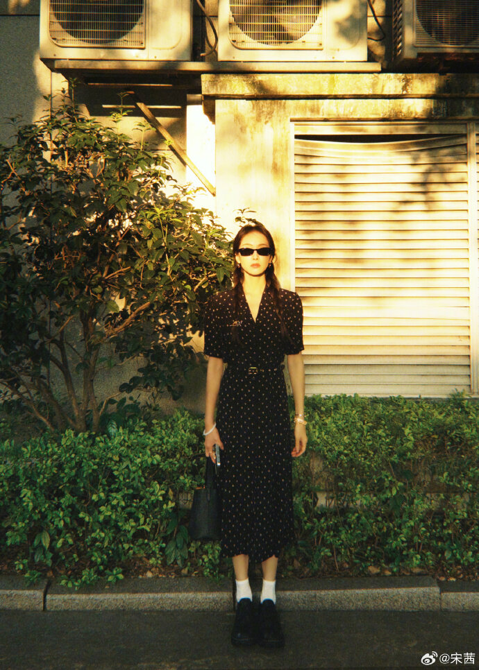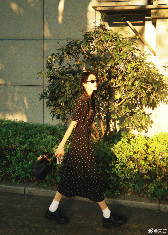 Song Qian wears a dotted floral dress, pure literature and art, standing freely and brightly in the sun