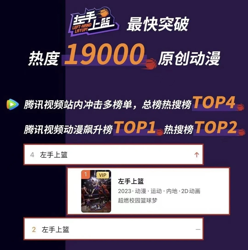 Since its inception, "layup with left hand" has made a lot of achievements: on the opening day, sports celebrities such as Yao Ming, Yi Jianlian and Zhou Qi played call; for it. The ending song of the animation was sung by Jay Chou. This is also the first time that Jay Chou has used his song on animation. Its on-site performance is also very eye-catching, just two episodes online, directly to the Tencent site animation list TOP2, becoming the fastest to break through 19000 of the original animation, and hit the list of the new original Top1.