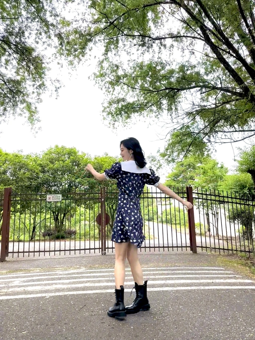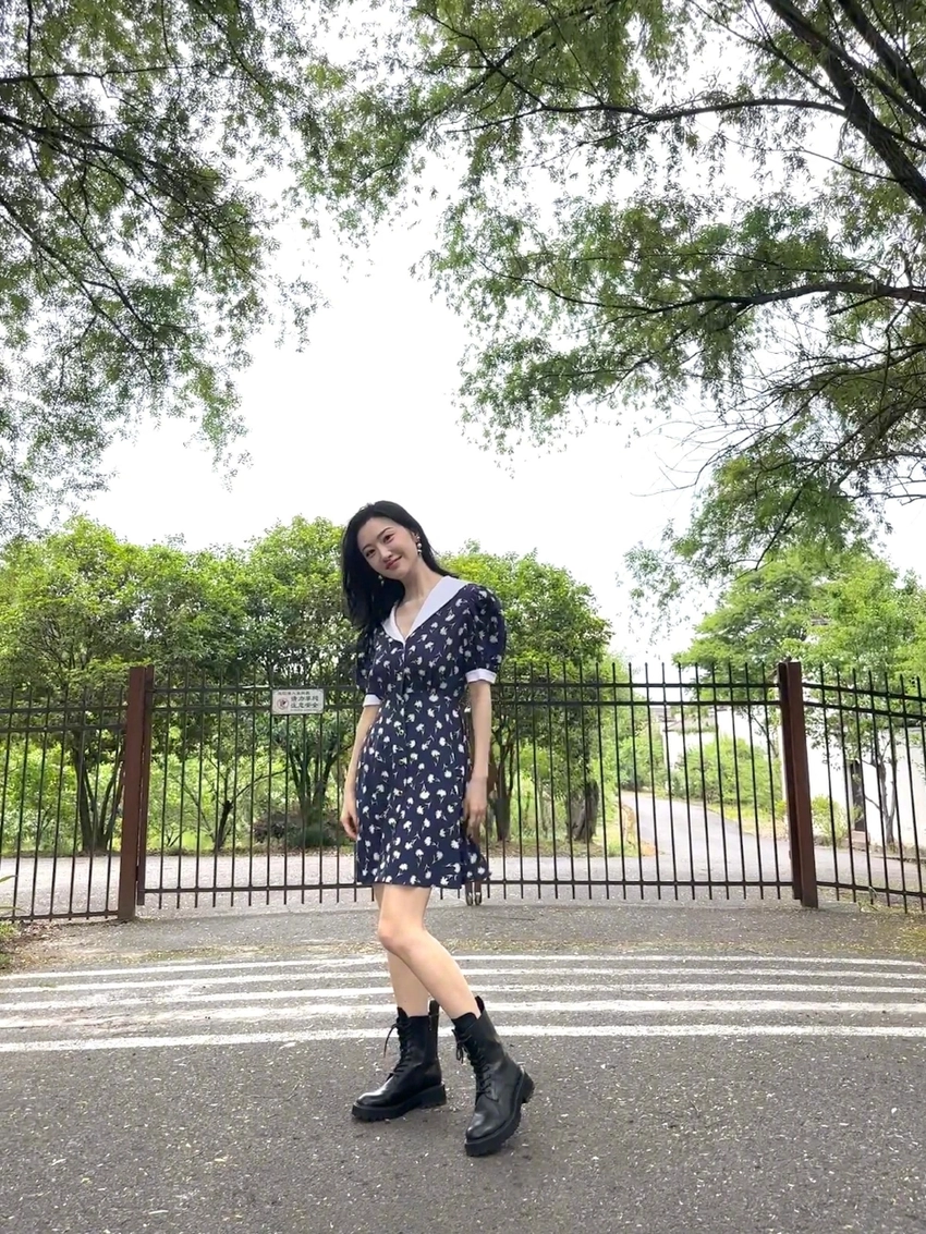 On May 26, Jing Tian shared the outdoor photo shoot of the summer outing, wearing a broken flower skirt with Martin boots, superior body proportion, cute and playful to the mirror.