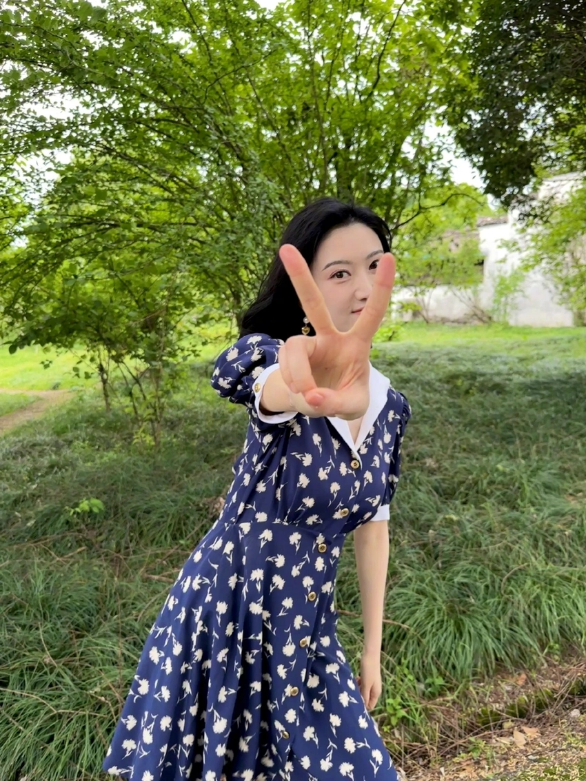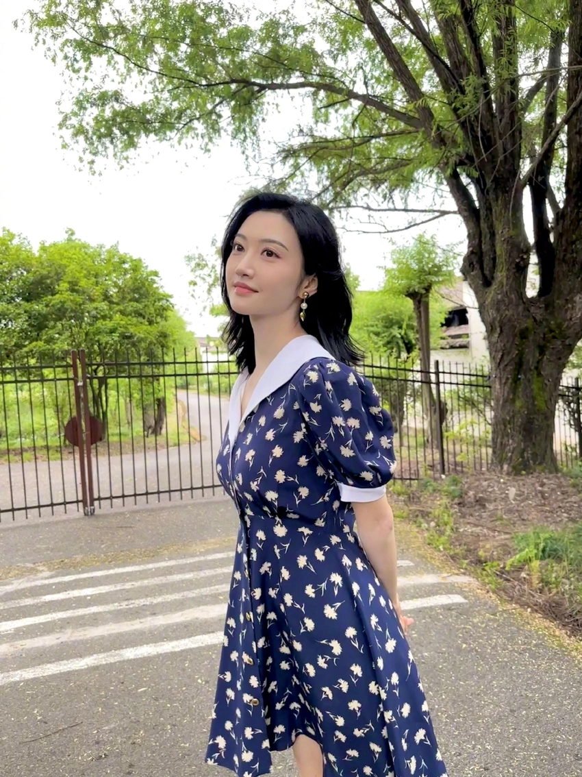 Jing sweetly basked in the summer outing, took pictures of the blue broken flower dress and felt like a young girl.