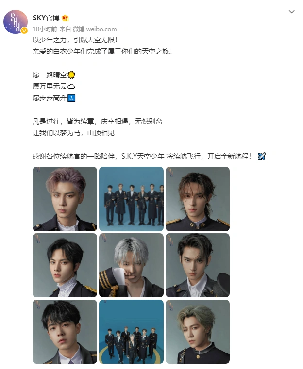 At 00 o'clock on August 28th, the official blog of the S.K.Y Sky Junior Group announced their graduation. "Thank you for your company. S.K.Y Sky Junior will continue to fly and start a new voyage!" It is reported that S.K.Y Sky Youth is composed of Li Xikan, Zuo Linjie, Hu Wenxuan, Guo Zhen, Zuo Ye, Zheng Renyu and Lin Mo.