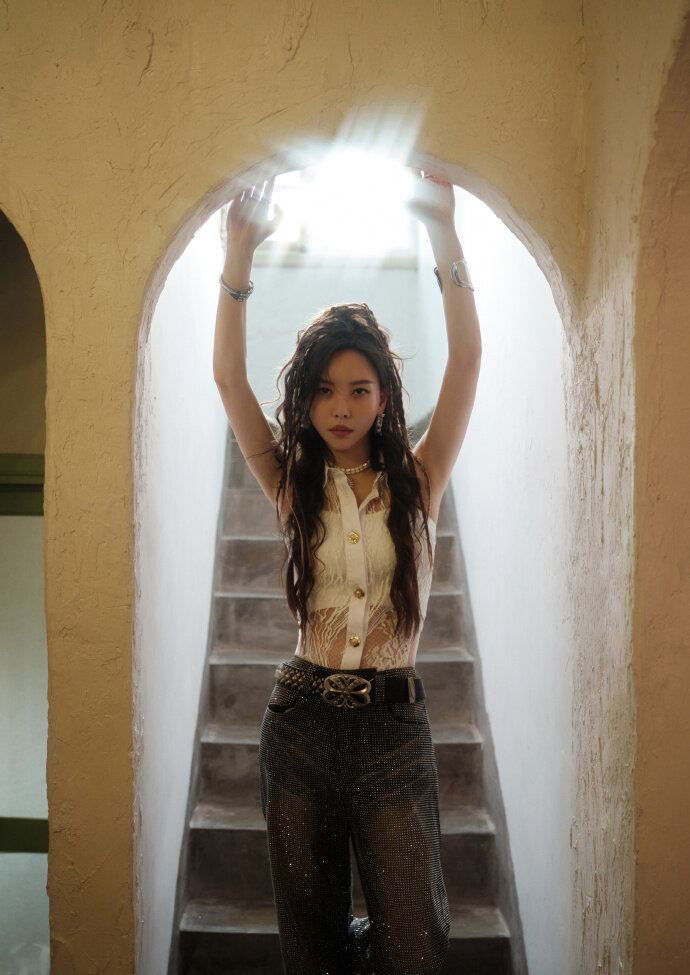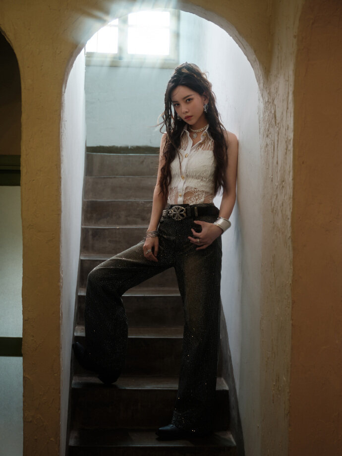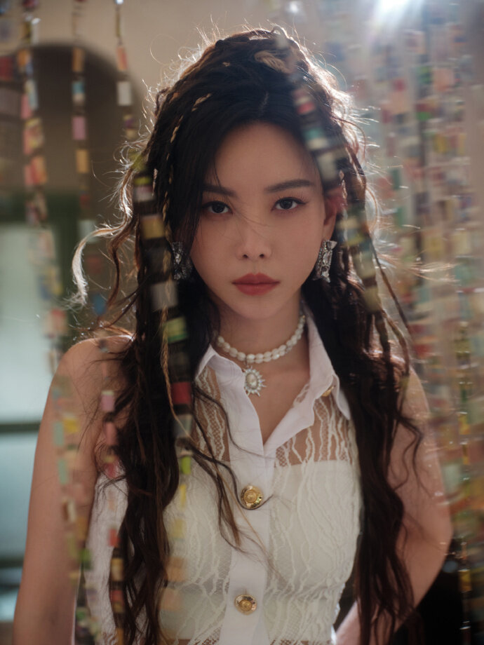 Yu Wenwen wears a white lace vest with graceful curves and curly hair with small smoky makeup and full of personality