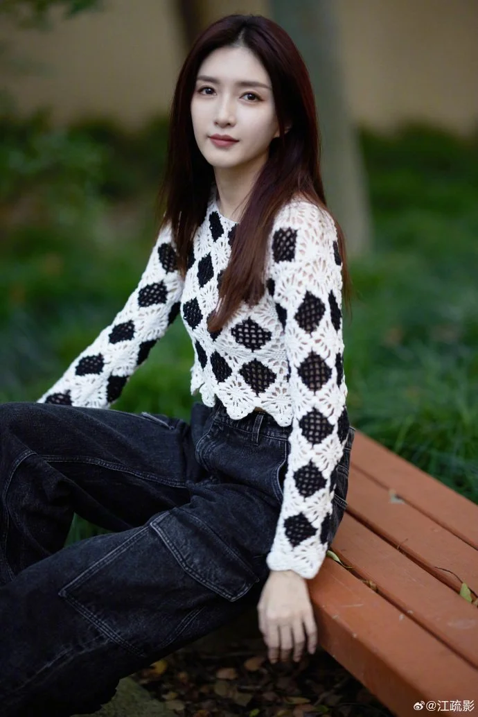 Jiang Shuying hollowed-out sweater is refreshing to greet September in black and white against gentle temperament