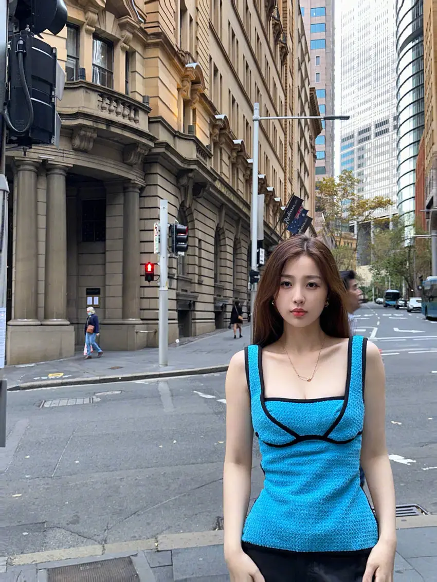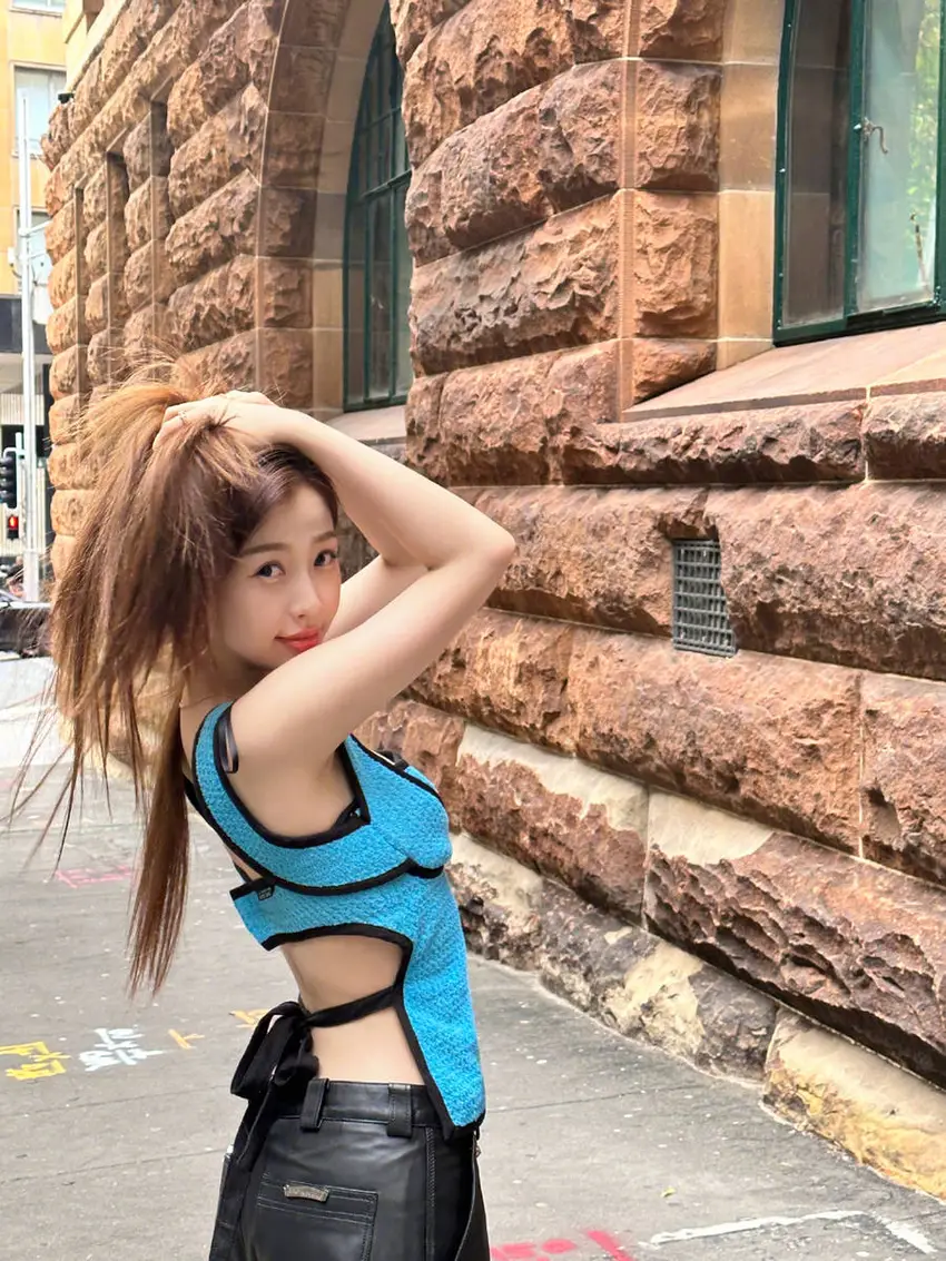 Yu Shuxin shared photos of playing in Sydney wearing a blue vest with a big beautiful back and a small waist.