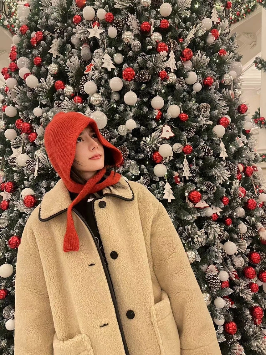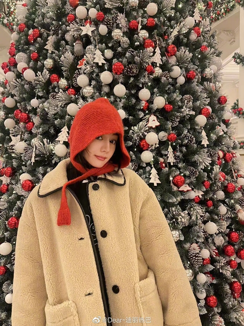 On the 27th, Dili Reba was photographed with a red hat. "the hat is red and the clothes are velvety. Everyone should pay attention to keep warm from the cold and spend the end of the year together safely and healthily." In the photo, Dili Reba wears a plush Little Red Riding Hood to take a picture of cocoa with the Christmas tree.