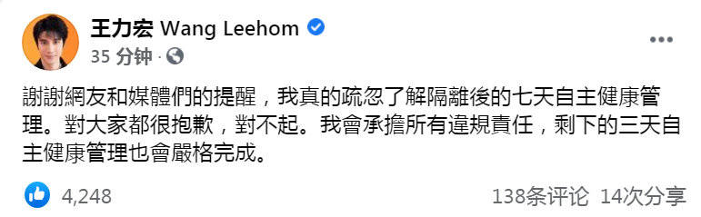 it is reported that artist Leehom Wang flew back to Taiwan from the United States a few days ago. After the 14 day isolation period ended on the evening of the 16th, he immediately went to his friend Xu ruoxian's house for dinner, including Chen Jianzhou, fan weiqi, the couple, and musician Chen Zihong. However, according to the regulations, Leehom Wang should independently manage his health for 7 days after the end of the isolation period, which is also considered by netizens on the island as a breach of epidemic prevention. For this, Leehom Wang has just issued an apology on the social platform: "I'm really negligent and will bear all responsibilities for violations." p>