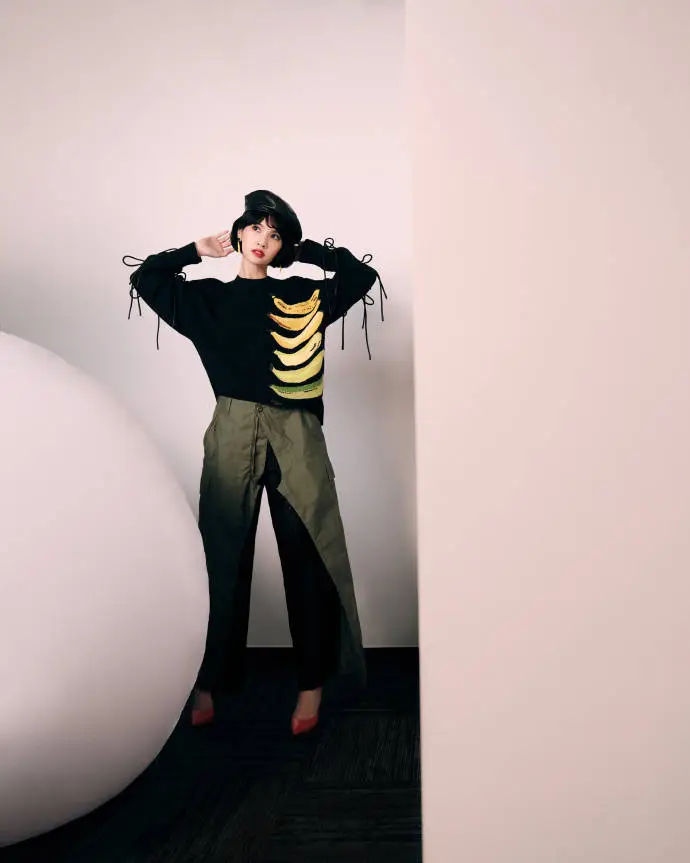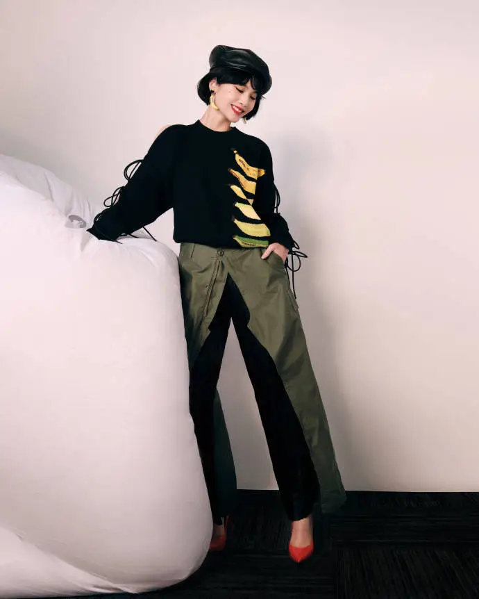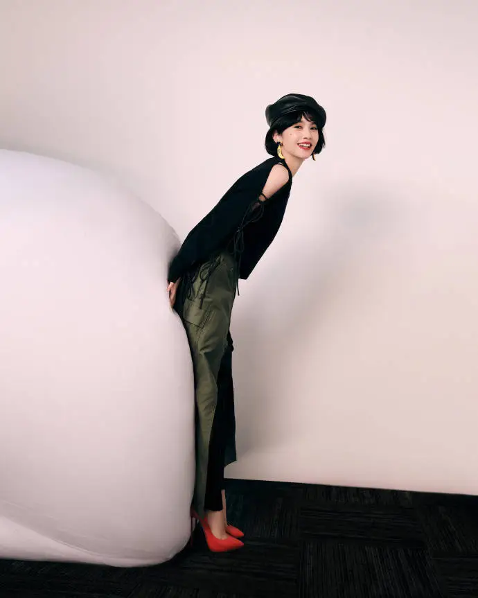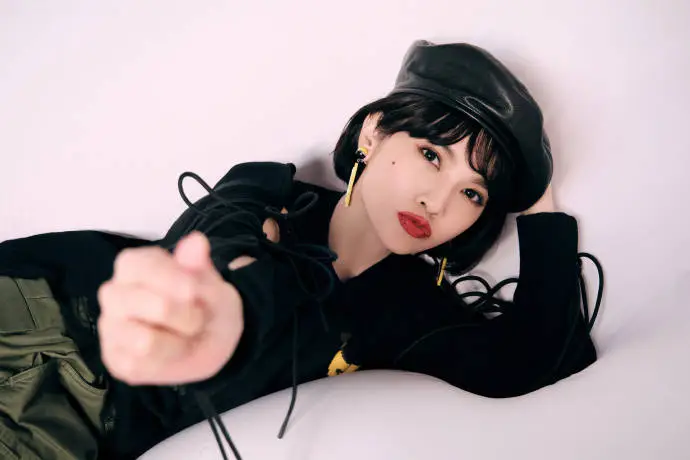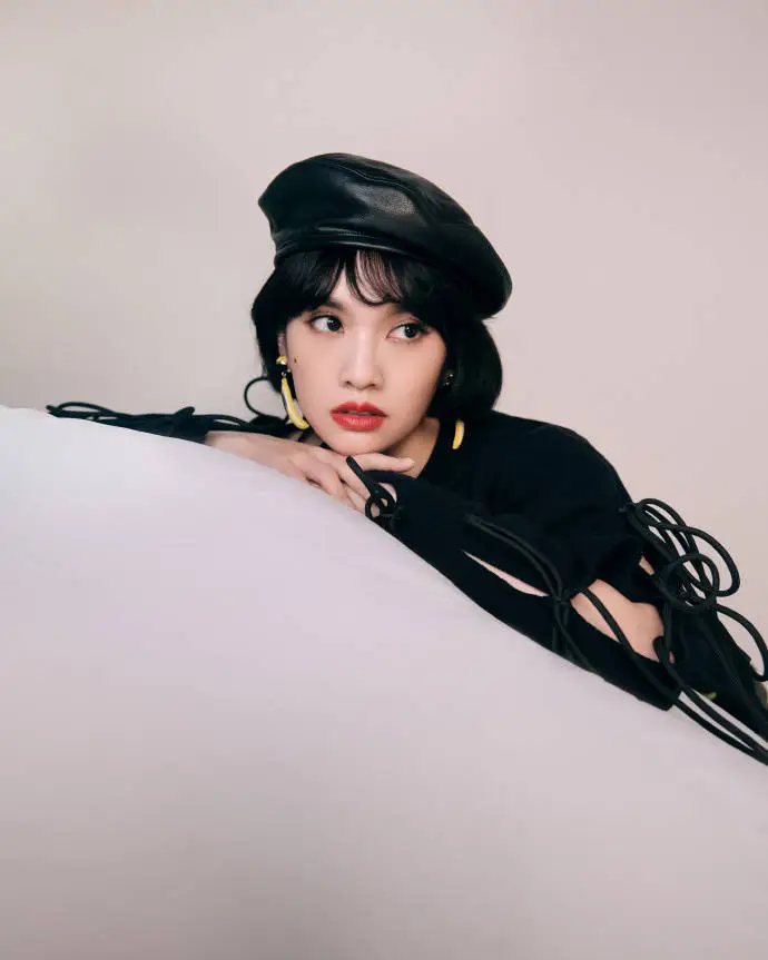 On August 29, Rainie Studio shared a set of styling portraits. Rainie wore a cool rustle, a beret and bright yellow earrings, setting off a good look and beeping her mouth to the c...