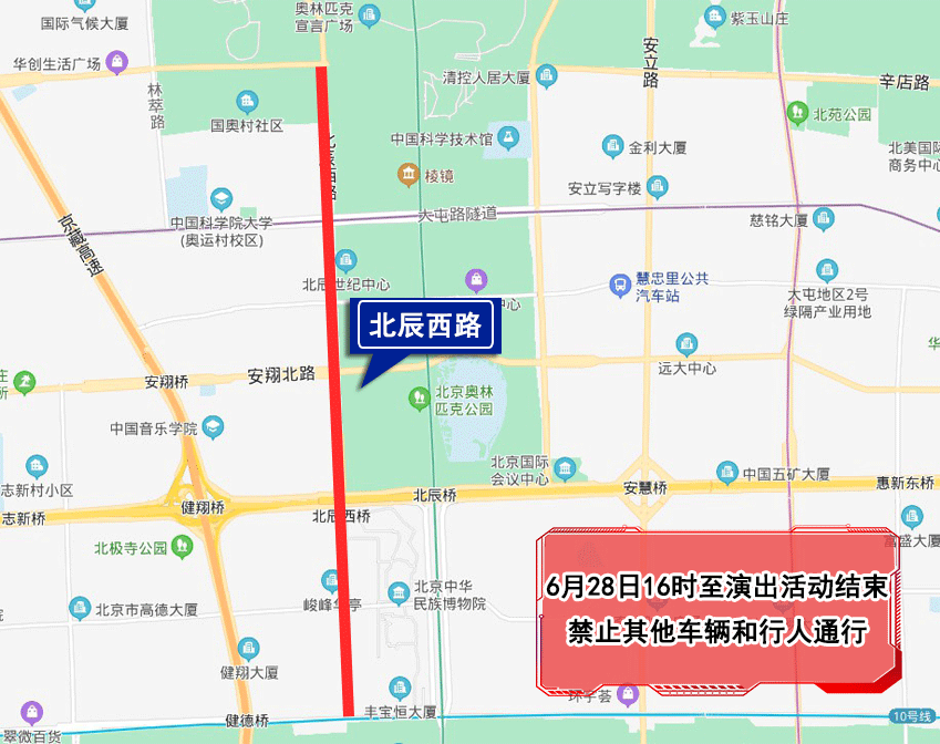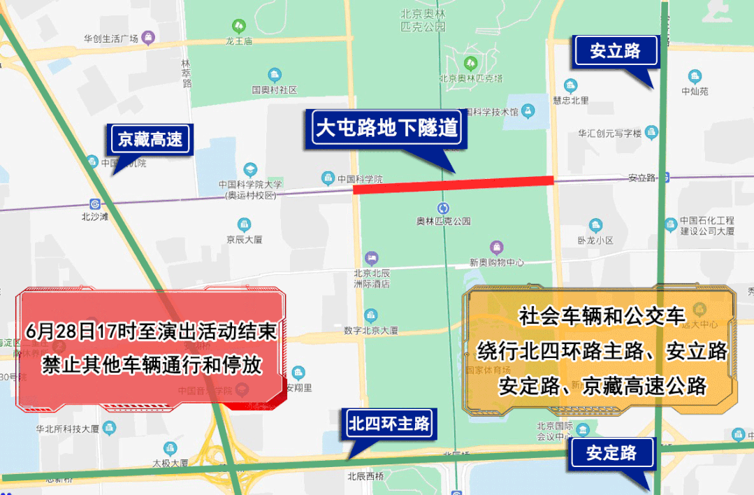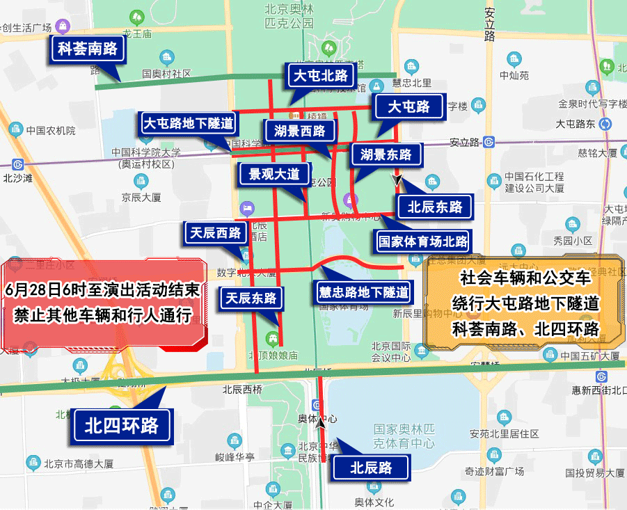 on June 28, from 14 to the end of the performance, Kehui South Road, the South and north auxiliary roads of the North Fourth Ring Road (Beichen East Bridge to Beichen West Bridge), Minzu Park Road, Olympic Sports Middle Road, and Beichen East Road, except for vehicles and personnel with special performance certificates, are prohibited from passing by other vehicles and pedestrians. Social vehicles and buses can bypass through the underground tunnel of Datun Road and the main road of the North Fourth Ring Road.