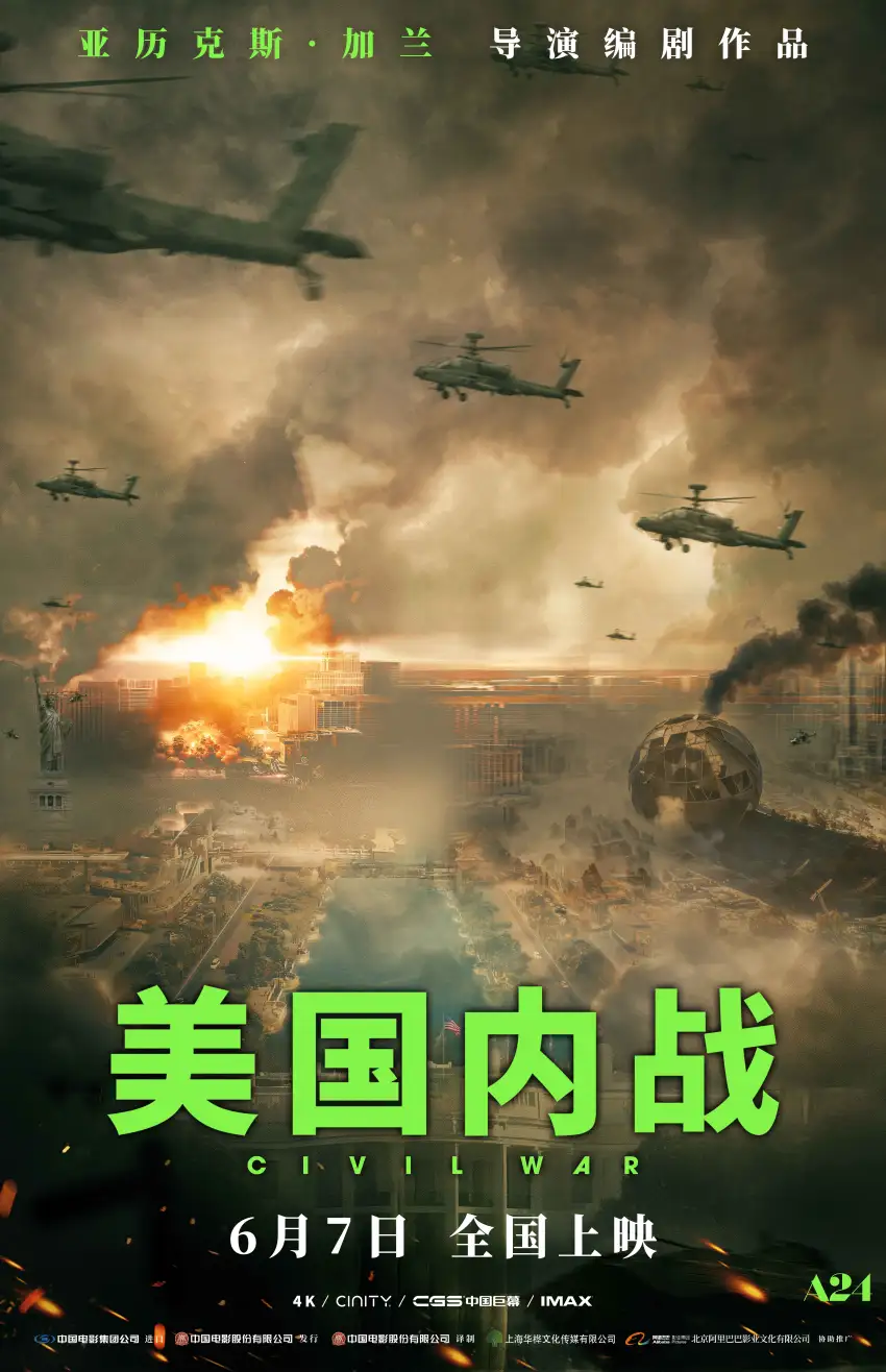 The American Civil War is produced by American A24 Pictures, written and directed by Alex Garland, starring Kirsten Dunst (Kirsten Dunst), Wagner Mara (Wagner Moura), Stephen Henderson (Stephen McKinley Henderson) and Carly Spini (Cailee Spaeny), imported by China Film Group, issued and translated by China Film Co., Ltd. Shanghai Huahua Culture Media Co., Ltd., Beijing Alibaba Film Culture Co., Ltd. to help promote, is now in the national hit.