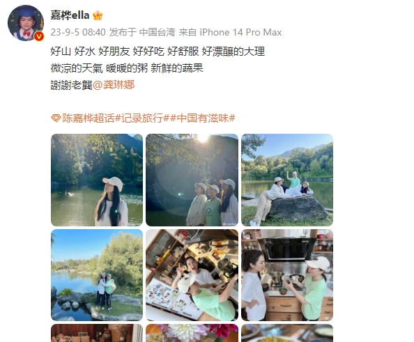 On September 5th, ella and Gong Linna toured Dali together: "good mountains, good water, good friends, good food, nice and beautiful Dali cool weather, warm porridge, fresh fr...