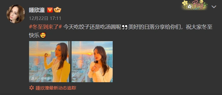 On December 22nd, Zhong Xintong (Gillian) posted a beautiful photo on the social platform to wish everyone the Winter Solstice happiness. "would you like to eat dumplings or dumplings today?" I would like to share a beautiful sunset with you. I wish you all a happy the Winter Solstice. "