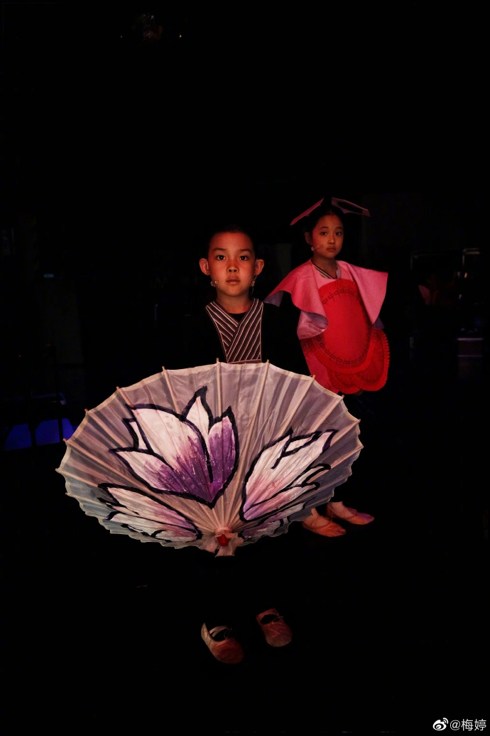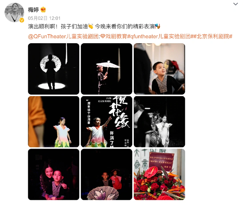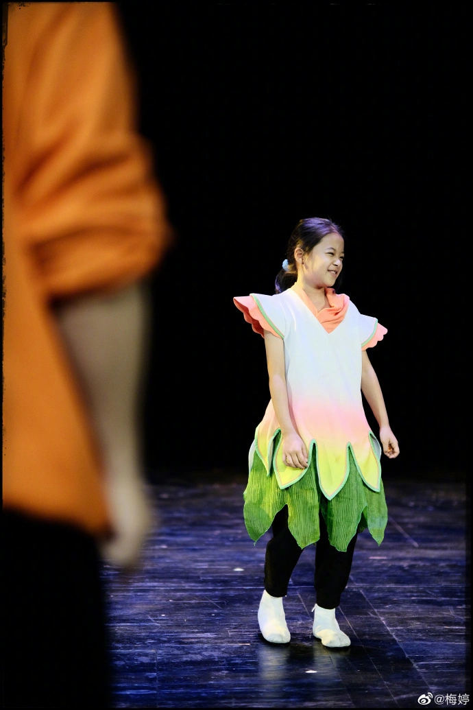 Recently, Mei Ting posted a message in support of her children's drama performance: "the performance went well!" Come on, kids, come and see your wonderful performance tonight, "and posted stills, which are cute and cute in costumes with Yangyang.