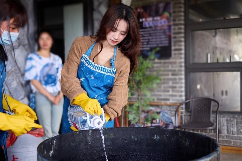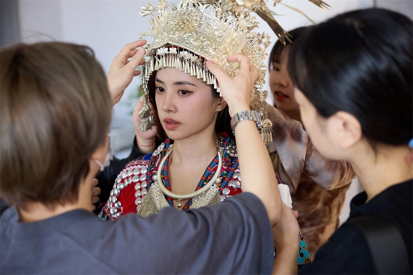 In addition to all kinds of food, Jolin Tsai also tried non-legacy tie-dyeing and put on an improved version of the "Miao dress". She tried Zhuang costumes in Nanning and challenged the Miao style this time. She often wore gold armor on the stage, and this time she changed into a silver collar and headgear; during Fashion week, she wore countless kinds of cloth, and this time she changed into delicate Miao costumes with wax dye and Miao embroidery. She changed into a Miao girl and wore local national costumes. With her footsteps, let the world see the charm from the local culture.