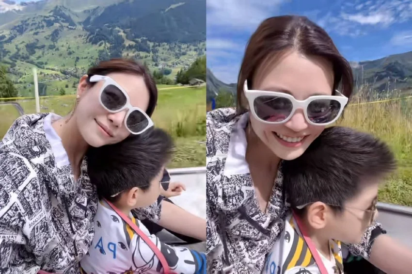On the 29th, Chen Yanxi shared a video of taking her son Little Star on holiday in Switzerland. In the video, Chen Yanxi and her son are both wearing sunglasses. Chen Yanxi leaned against her son's head and smiled sweetly into the camera, revealing the sweet pear vortex. The little star is also humming happily.