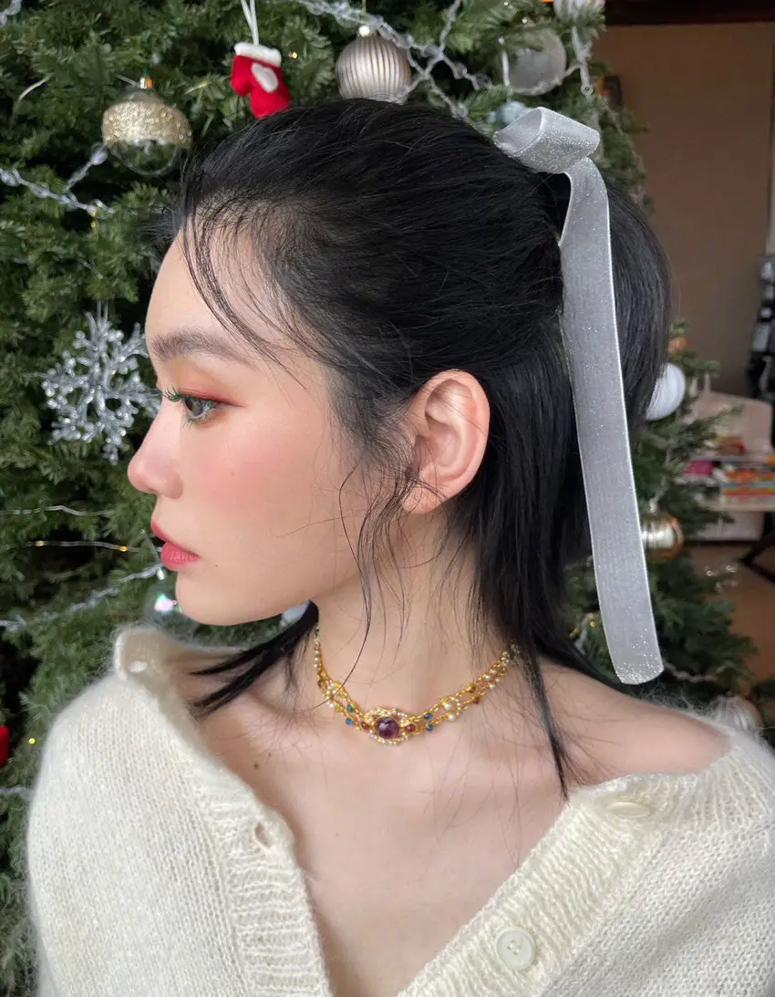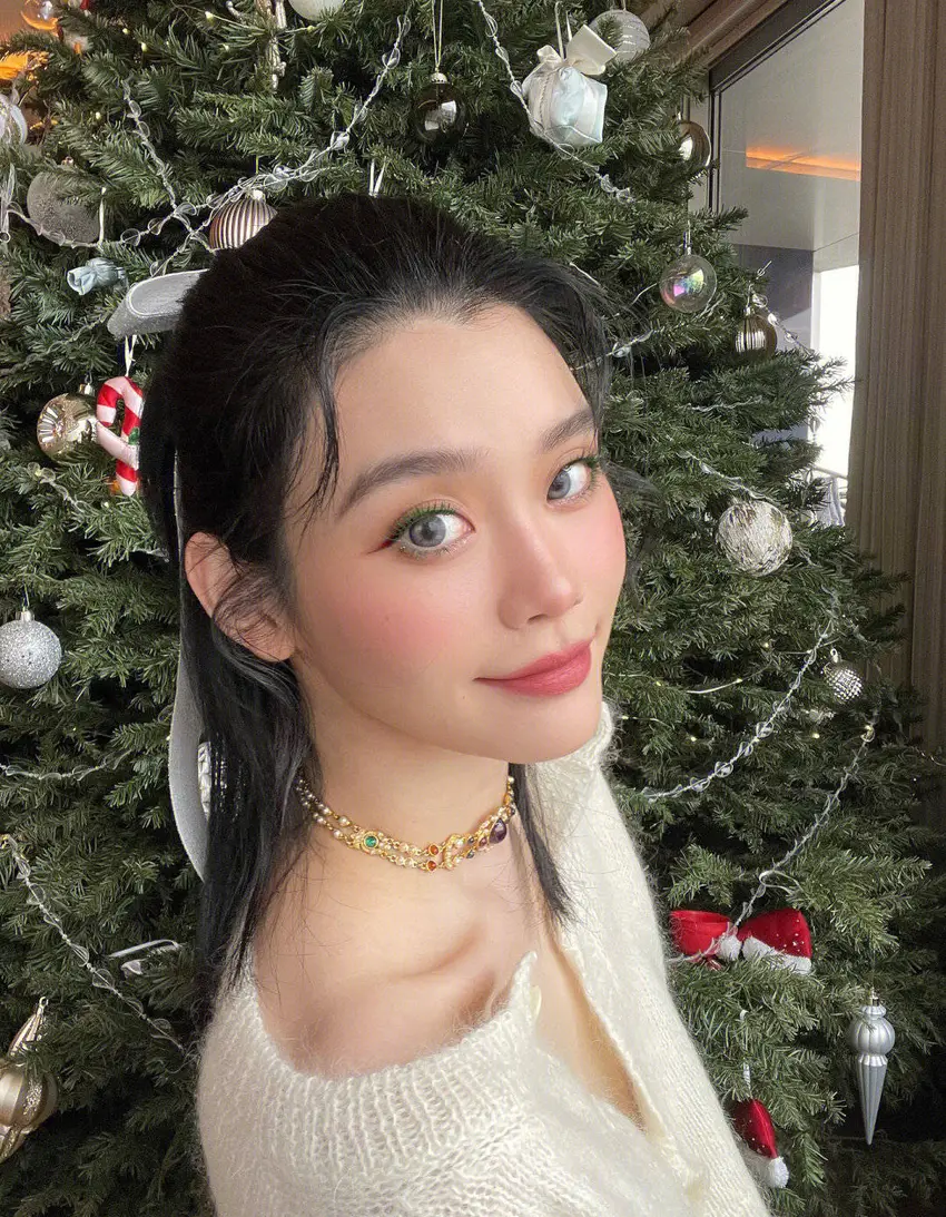 Xi Mengyao painted green eyelashes Christmas atmosphere thick than sweet smile exquisite collarbone
