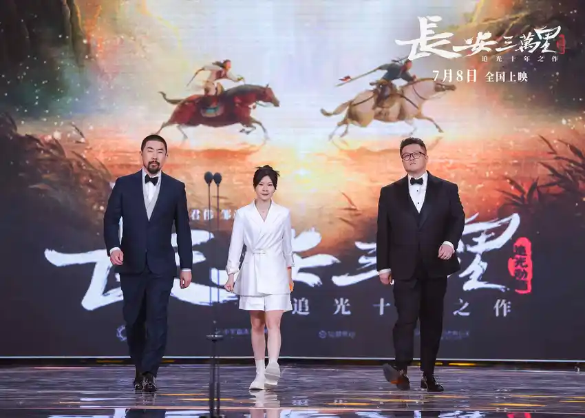 As the beginning of the "New Culture" series of light-chasing animation, "Changan 30,000 li" has captured the eyes of thousands of viewers as soon as it was unveiled. When they came to the event, in the introduction of "the poetic Tang Dynasty inserted the wings of imagination", the three creators boarded the red carpet of public attention. Towards the end of the ceremony, a group of blockbuster recommended films were announced at the scene. "thirty thousand miles in Chang'an" was impressively listed, and Tang Feng Gu Yun caught people's eyes. In the subsequent promotion session of the new film, the two directors and producers stepped onto the stage to introduce to the national audience the magnificent features of the film, the magnificent features of Datang and the resplendent group images of Tang poetry, which are the core of "Changan 30,000 li", and issued to everyone the sincere invitation of "July 8, the cinema does not see the end".