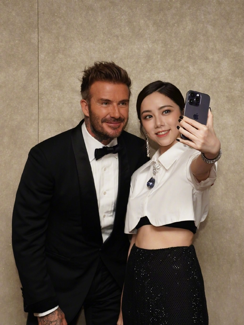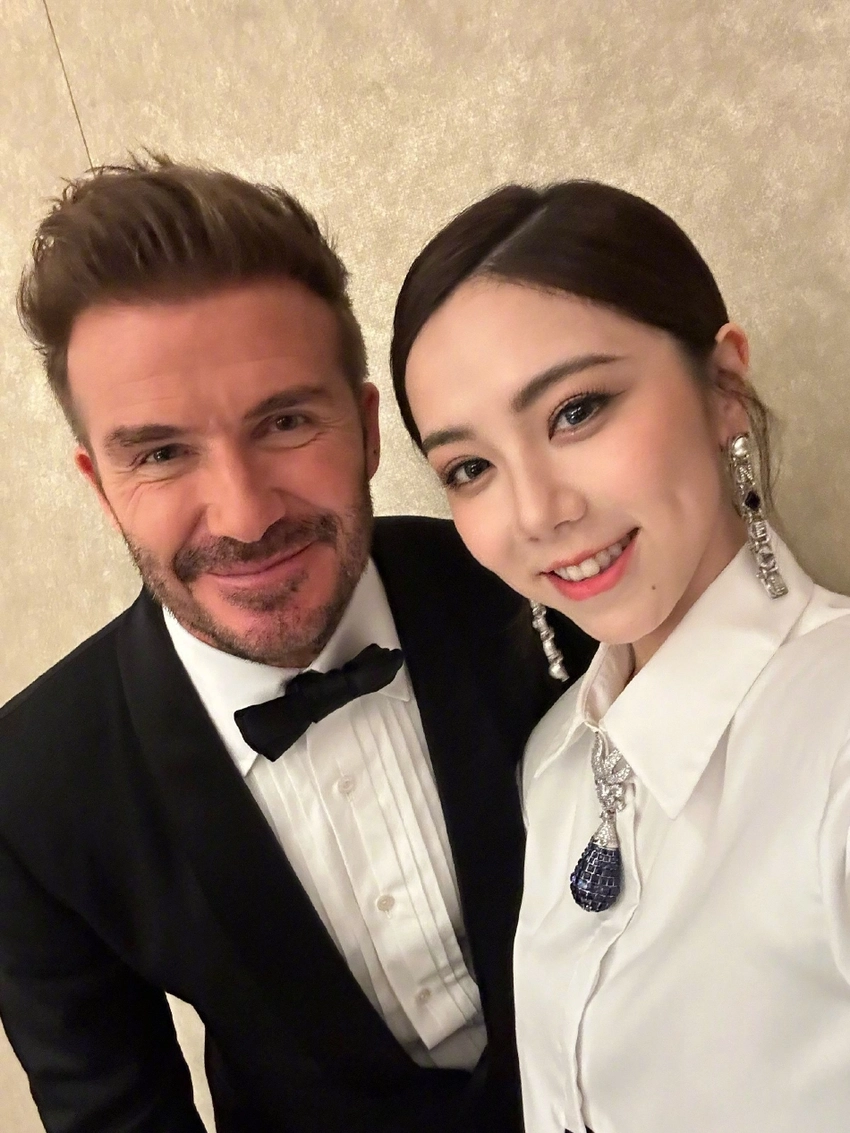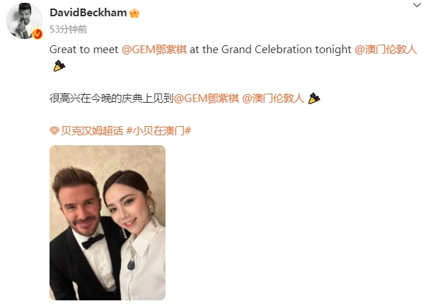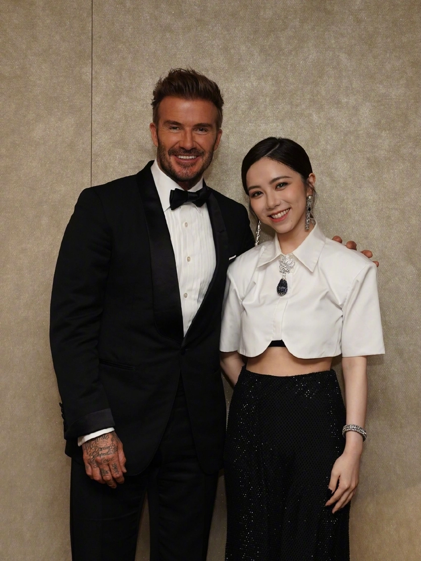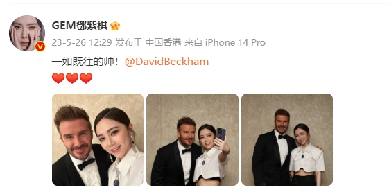On May 26, Deng Ziqi and Beckham posted a photo together. Deng Ziqi praised Beckham as "as handsome as ever." Beckham also said he was happy to meet Deng Ziqi.