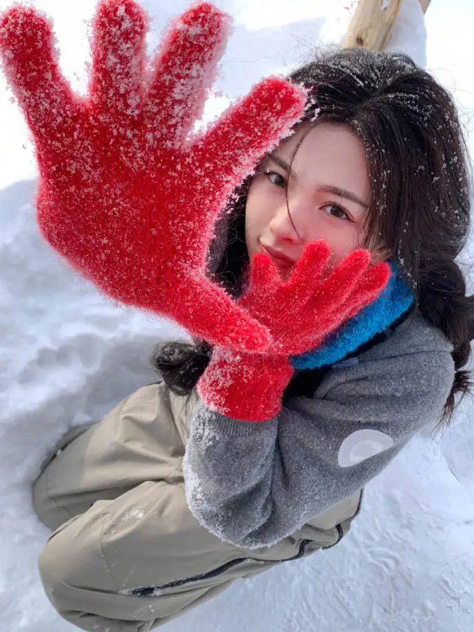 Yang surpasses the first snow to take photos cute and cute with red gloves and a pair of ponytails
