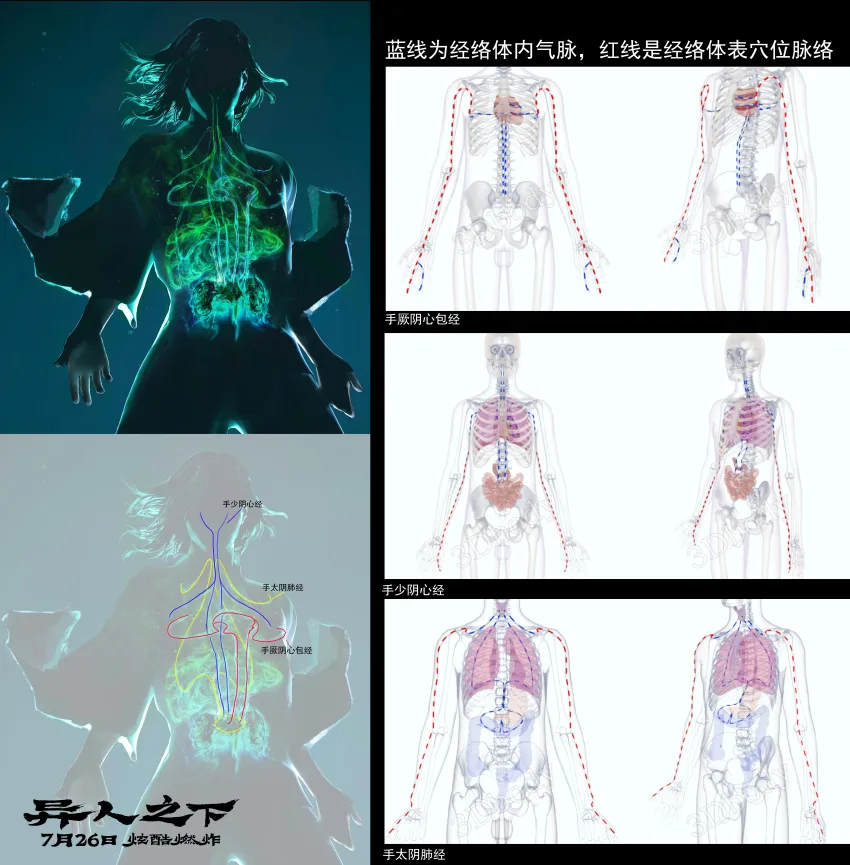 In addition to Jin Guang Shu, the Yin-Yang Wuli showdown between Zhang Chulan and Zhang Lingyu in the previous forecast also left a deep impression on many viewers. In addition to the gorgeous visual effects, there are many "exquisite" behind Lei Fa. The conceptual design team of the film also shared with you the different operating principles and color designs of Yin Yang Wuli. Zhang Chulan's Yang Wuli comes from the energy of the heart and lungs, the heart is red and the lungs are white. It starts from the energy of the heart and lungs, then transfers to the three yang meridians of the hand, sends out from the acupoints, and finally shows red and white. While Zhang Lingyu's Yin Wuli is transferred by liver and kidney, the liver wood is blue and the kidney water is black, which reaches the whole body through the three yin meridians of the hand, and finally shows blue and black. Although he insisted on being loyal to the original work in the adaptation, the director Wu Ershan also said bluntly, "this is not a setting in the cartoon, but Yin and Yang Wu Lei needs a complete logic." This way of starting and running, as well as the color of the functional method, all come from the theory of the five elements and meridians. What also arouses the interest of Urshan is the setting of the function of "Twelve Labor Array" by Gao Ning (Sang Ping). The "Twelve Labor Array" manipulates people's twelve meridians and then controls the foot Jueyin liver Meridian, allowing the victim to struggle repeatedly in both positive and negative emotions, and finally fall into some extreme mood and have a mental breakdown. And this exquisite design is also "completely restored" in the film.