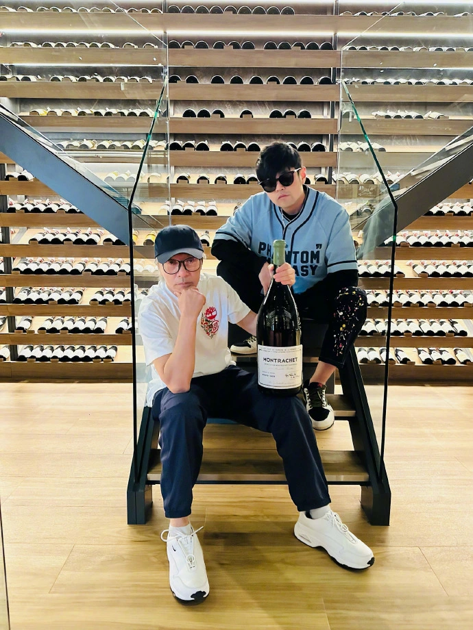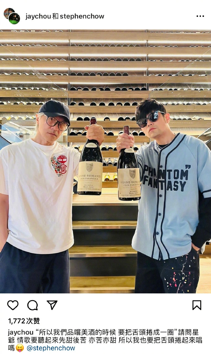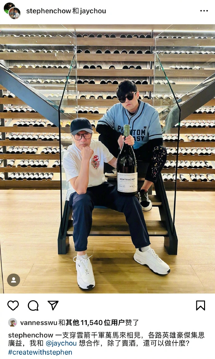 Dream linkage! Zhou Xingchi and Jay Chou take a picture in the same frame and the two are in good condition to hold up the wine bottle.
