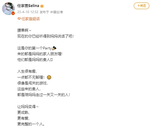 On April 10, Selina Ren Jiaxuan held a party with family and friends for her baby and posted a number of photos. Wearing a pink sequin dress and a blue bow, Selina took smiling photos with his family, Hebe, Ella, Yoga Lin, Huang Ziyi and other friends.
