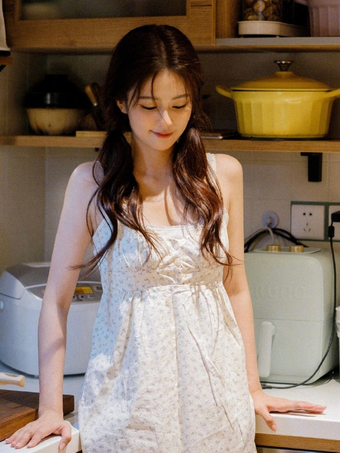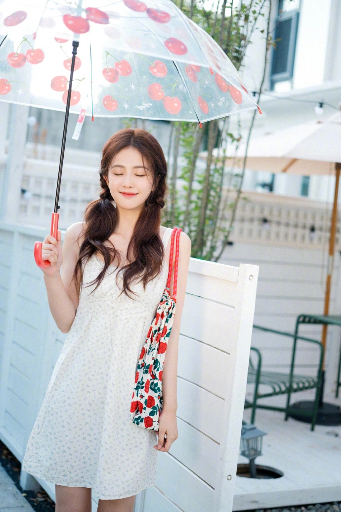 On May 15, Bai Lu shared a set of stock photos from last summer. She was fresh and sweet in a white broken flower dress, double ponytail and holding a transparent cherry umbrella.