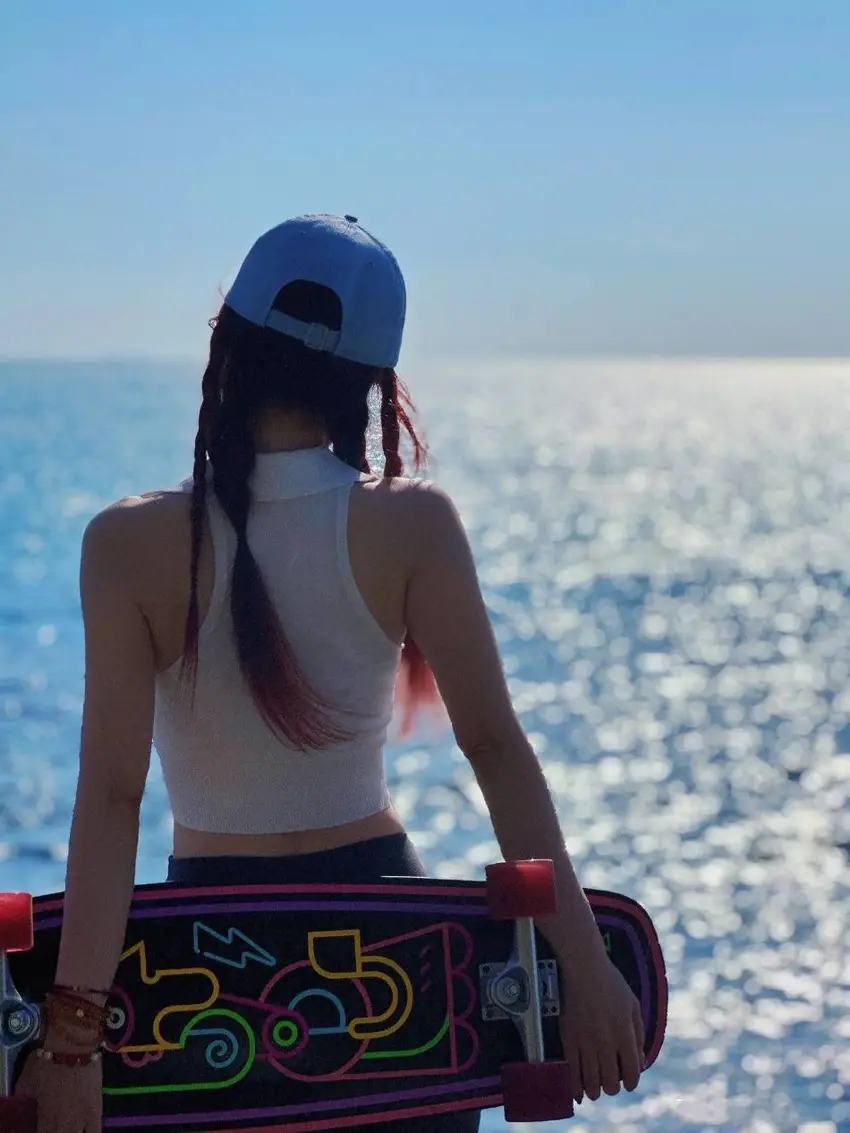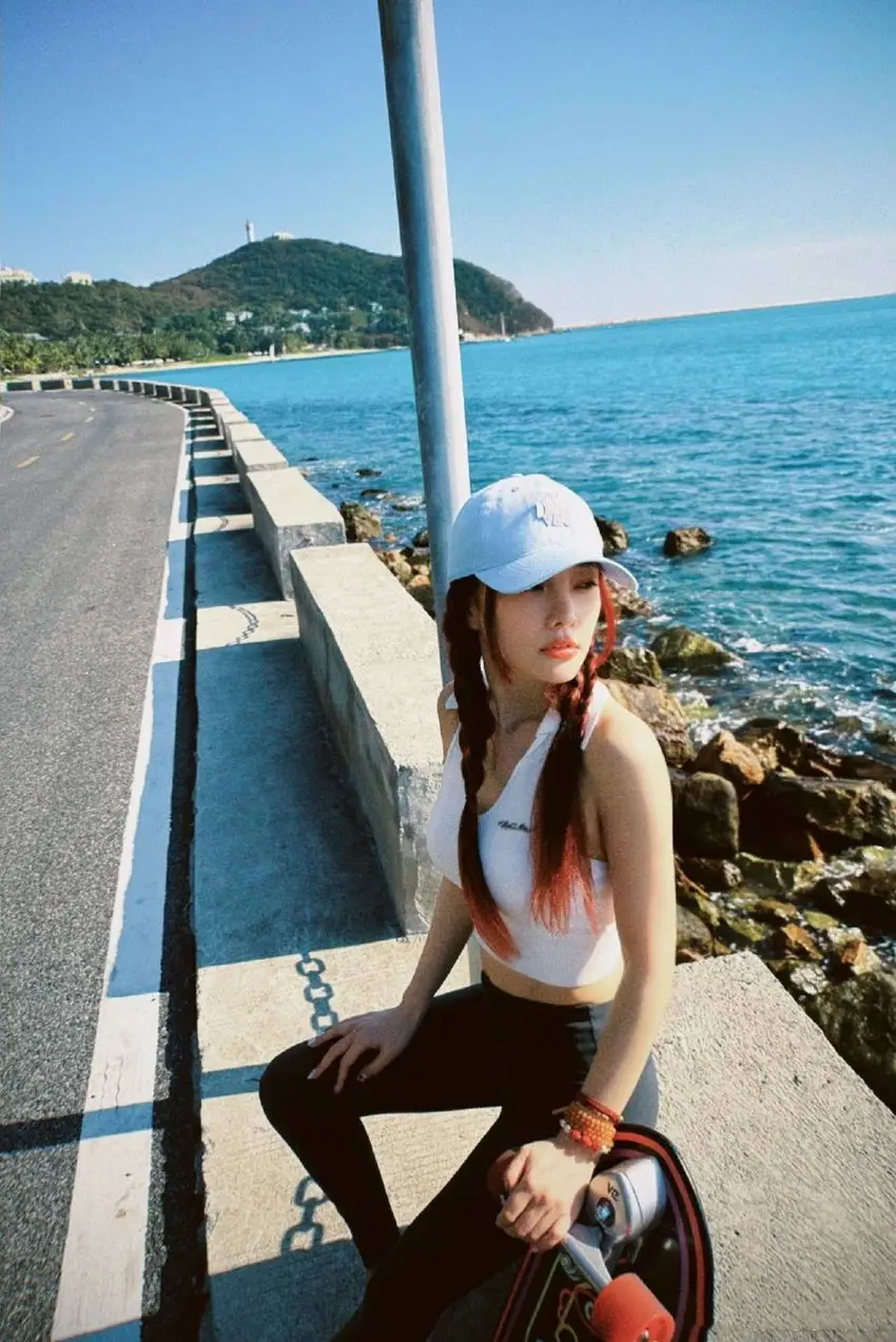 On February 6, Li Xiaolu posted a group of beautiful photos of skateboarding at the seaside. In the photo, Li Xiaolu is wearing a waist dress, her figure is slim and hot, and she feels like a young girl.