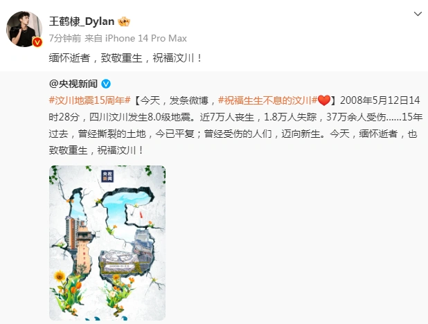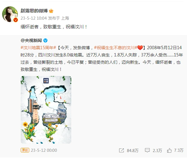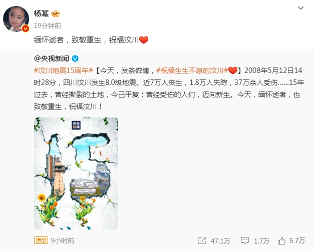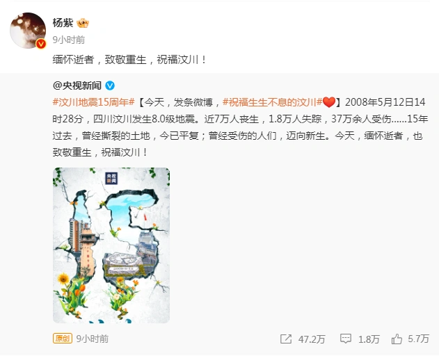 ブン川地震15周年楊幂趙麗穎らの多くの星が亡くなった人を追悼して再生に敬意を表します 全文约48字, 阅读需要1分钟 5月12日はブン川地震15周年の日であり、2008年の今日、四川ブン川で8.0級の地震が発生し、7万人近くが死亡し、1.8万人が行方不明になり、37万人余りが負傷した。星たちは微博で亡くなった同胞を追悼し、再生にも敬意を表した。 5月12日はブン川地震15周年の日であり、2008年の今日、四川ブン川で8.0級の地震が発生し、7万人近くが死亡し、1.8万人が行方不明になり、37万人余りが負傷した。星たちは微博で亡くなった同胞を追悼し、再生にも敬意を表した。 関連人物