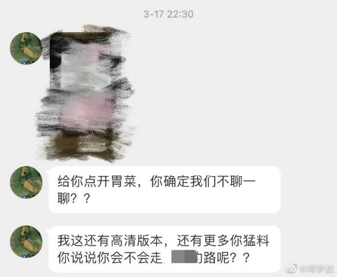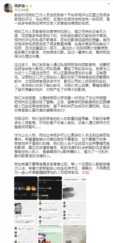 19日、盗撮恐喝に応じた蒋夢綺は、数年前に繁華街でスカートの底を悪意で盗撮され、動画が大々的に拡散され、脅迫されたと発表した。現在、蒋夢〓側はすでに警察に通報して処理し、脅迫した容疑者は現在警察にコントロールされている。