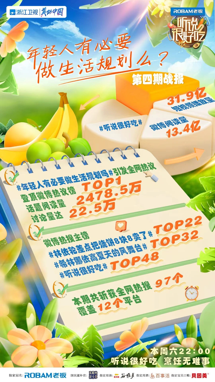 番組放送後、# 若者は生活計画をする必要がありますか# 全ネットで話題になりました。微博ブームランキングTOP 1にランクインし、話題の読書量は2478.5万人に達し、22.5万人が話題の討論に参加しました。# 林依輪は焼餅8枚を8枚で売りそうになりました# 微博ブーム検索主ランキングTOP 22,# 希林娜依高夏の風舞台# 微博検索主TOP 32に上陸しました。今まで、# おいしいと聞きました# 微博主話題の読書量は13.4億、ショートビデオ再生数は31.9億に達しました。今期は全網熱検索97個を獲得し、12個のプラットフォームをカバーした。