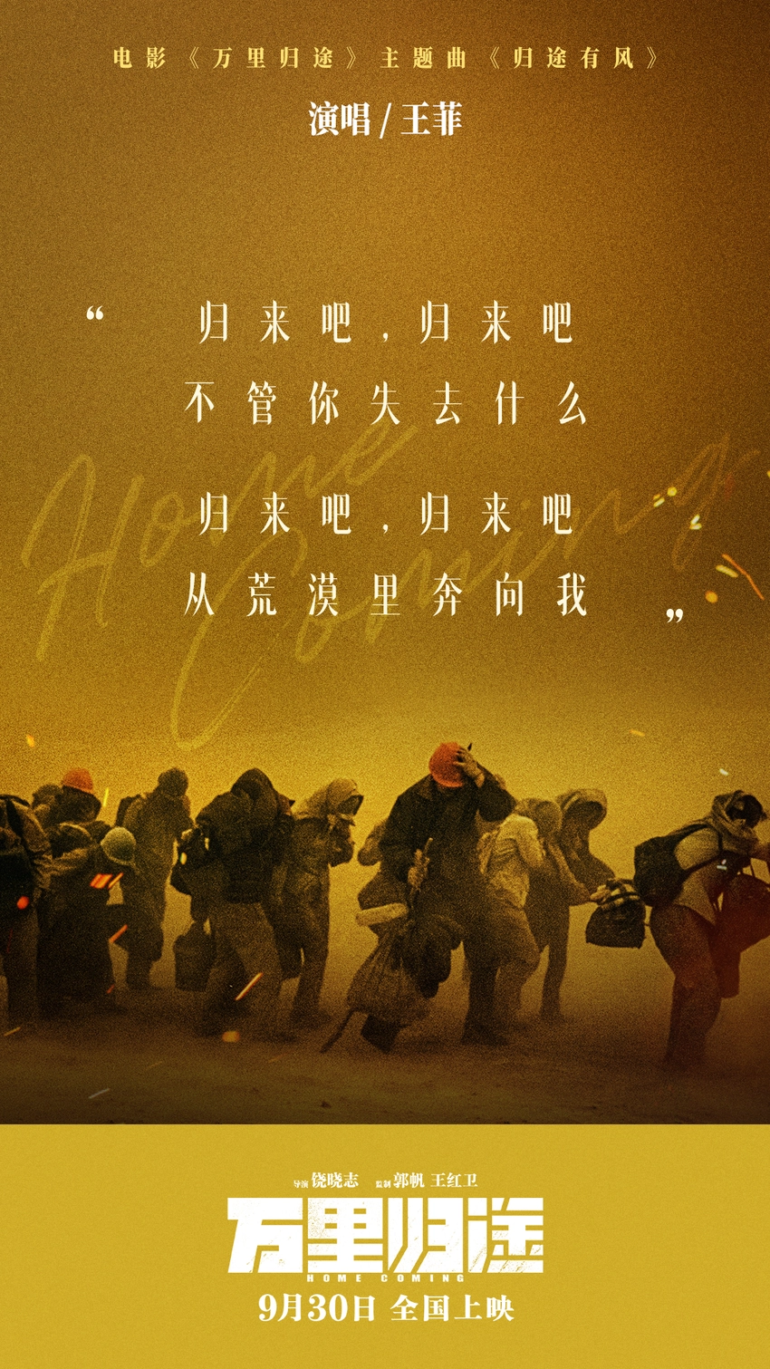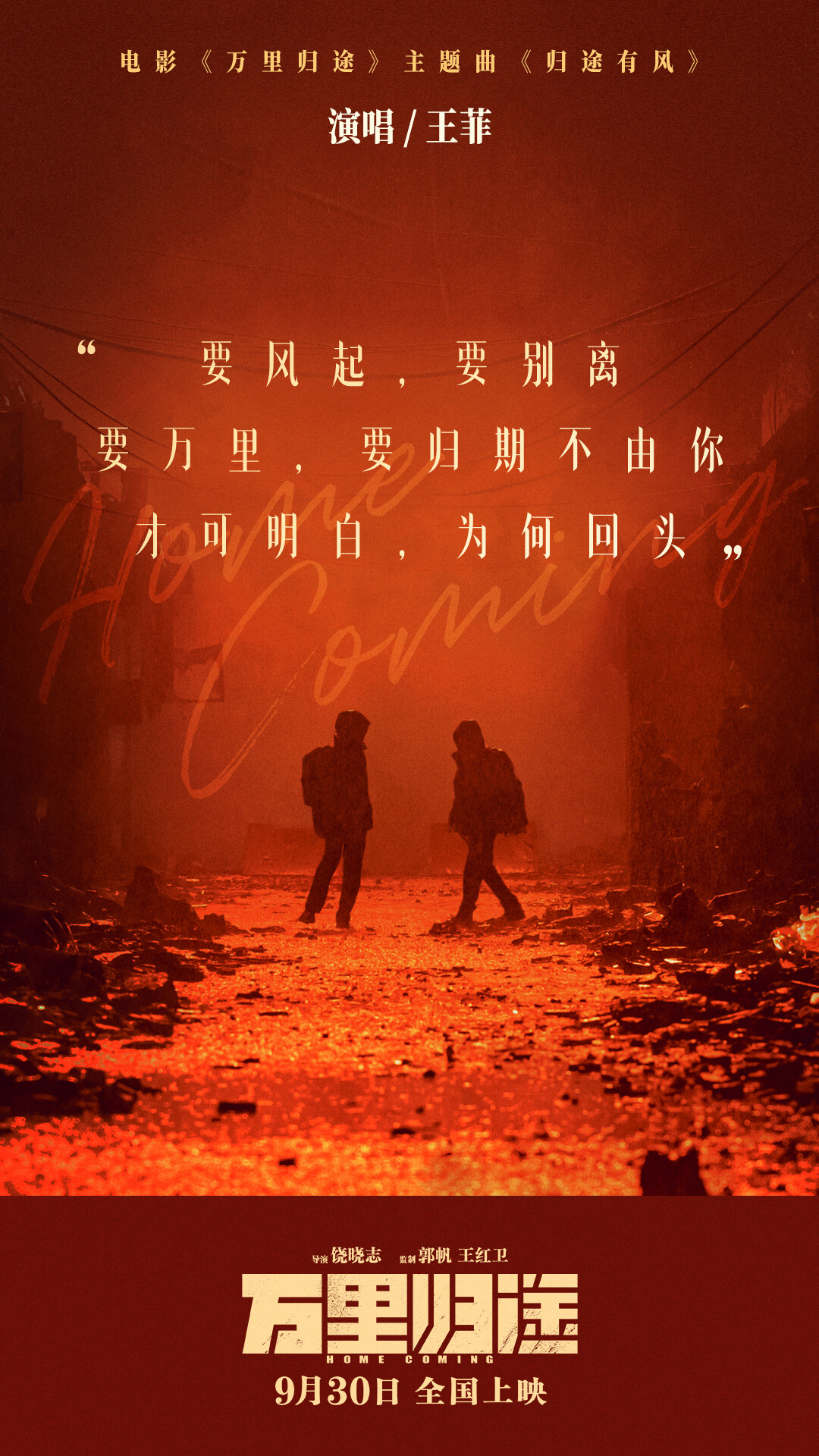 饒暁志監督、郭帆、王紅衛が監修し、張訳、王俊凱、殷桃を筆頭に主演する国慶枠映画“万里の帰り道”が、王菲が歌う主題歌“帰途有風”のミュージックビデオを発表した。歌は銭雷が作曲し,唐が作詞した.王菲独特の音色と節回しに、真摯で感動的な歌詞が合わせられ、戦火と砂漠を越えた“万里の帰り道”をひときわ感動させた。この曲は映画のエンディングテーマでもあり、昨日映画が北京で封切られ、多くの観客が映画を見た後、この歌に感銘を受け、“王菲のエンディング曲が出ると涙が出て、最後まで聞いて、別れを惜しむ。さすが王菲”とコメントしている。