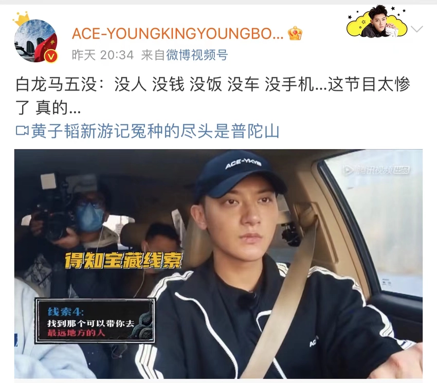 黄子韜無実種の法則は遅れても到着し、隠し宝を手に入れたいと思って、「一番遠くまで連れて行ってくれる人を見つけた」という手がかりを誤って理解した後、一人で普陀山行きのマイクロバスに乗り、暗くなっても目的地に着いていなかった。黄子韜は途中下車を選ばないことに気づいたが、郊外の野嶺にいることに気づき、思わず頭を抱えて崩れ、画面は笑ってもいられなかった。番組が放送された後、黄子韜は「白龍馬五没:人がいない、金がない、ご飯がない、車がない、携帯電話がない……この番組はあまりにも惨めで本当だ」と文を送り、行間には心の痛みがにじみ出ていた。ネットユーザーは黄子韜が参加したのは新旅行記ではなく変形計だとからかっていたが、この番組は黄子韜が傷ついた世界だけが達成された。