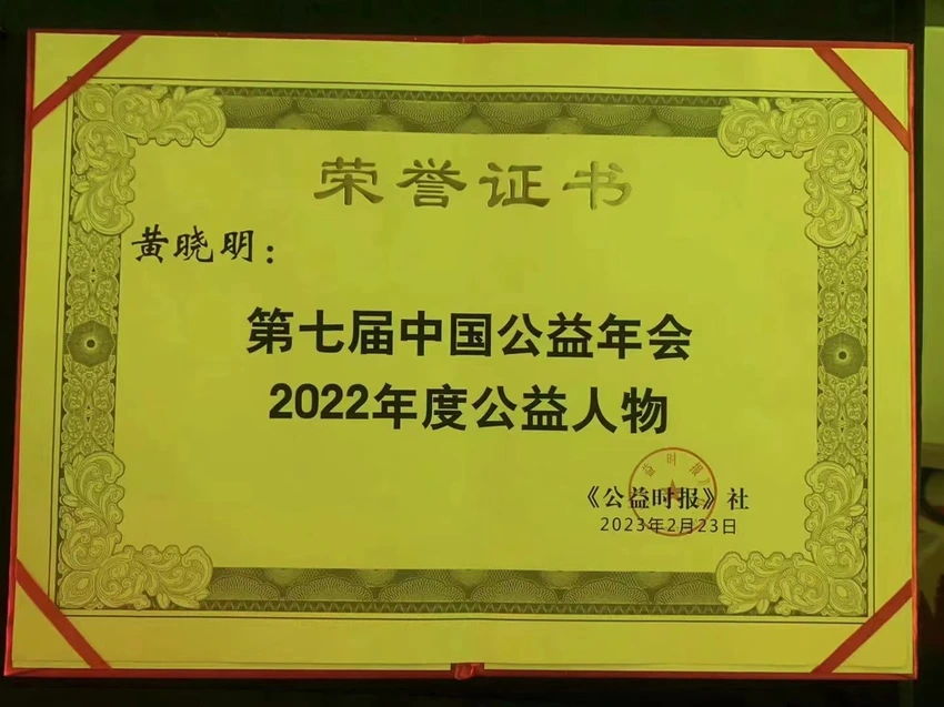 2023年2月23日、第7回中国公益年会は北京で開催され、そして“新時代の新征途の新発展”をテーマに、2023年の公益事業の発展傾向を深く検討し、そして年度公益人物、公益企業及び公益プロジェクトに敬意を表した。今回の年会では、黄暁明と河仁慈善基金創会人の曹徳旺、中華児慈会理事長の王林、2回の冬季五輪チャンピオンの武大靖、“ポケットママ”の彭霞などが同じく2022年の“年度公益人物”賞を受賞し、黄暁明は文化娯楽分野からこの賞を受賞した唯一の公益人物であることが注目される。