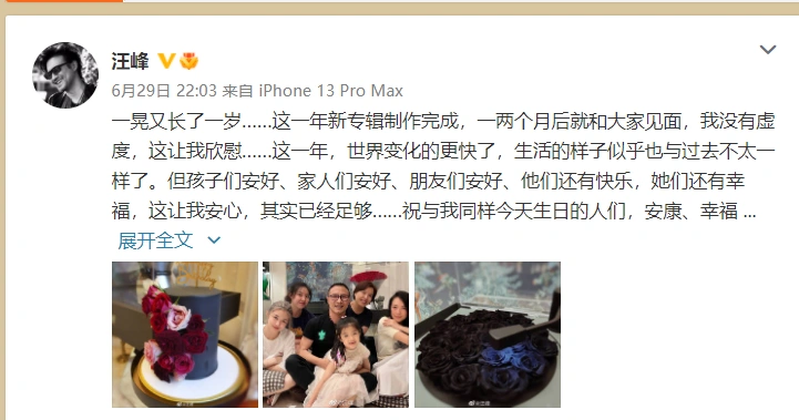 汪峰晒全家合照为自己庆生 透露新专辑将和大家见面 全文约188字, 阅读需要1分钟 照片中,他怀抱女儿醒宝,妻子章子怡和大女儿小苹果陪伴在身侧,画面温馨有爱。 6月29日是汪峰生日,他晒出全家合照为自己庆生,配文写道:“一晃又长了一岁……这一年新专辑制作完成,一两个月后就和大家见面,我没有虚度,这让我欣慰……这一年,世界变化的更快了,生活的样子似乎也与过去不太一样了。但孩子们安好、家人们安好、朋友们安好、他们还有快乐,她们还有幸福,这让我安心,其实已经足够……祝与我同样今天生日的人们,安康、幸福。祝生于6月29日的我们,生日快乐!”照片中,他怀抱女儿醒宝,妻子章子怡和大女儿小苹果陪伴在身侧,画面温馨有爱。 相关人物