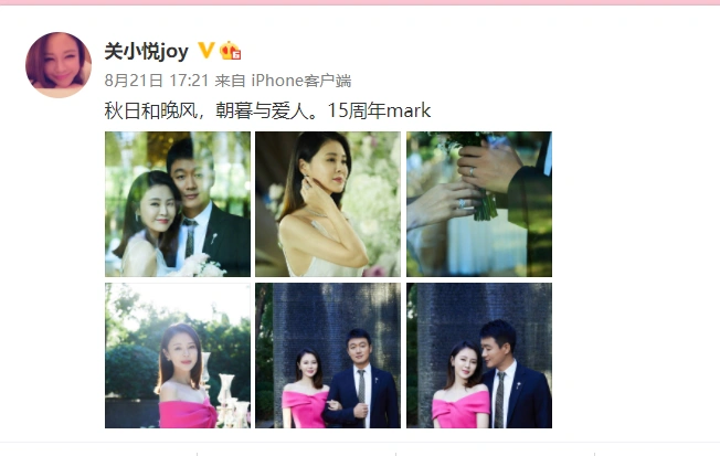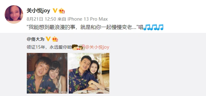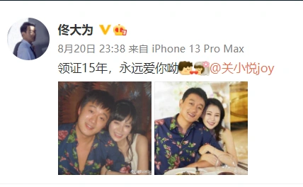 关悦庆祝与佟大为领证十五周年 晒两人甜蜜合照撒狗粮 全文约47字, 阅读需要1分钟 8月21日,关悦晒照庆祝与佟大为领证十五周年,并配文:“秋日和晚风,朝暮与爱人。15周年mark。”照片中,两人穿着正式,仪式感满满。 8月21日,关悦晒照庆祝与佟大为领证十五周年,并配文:“秋日和晚风,朝暮与爱人。15周年mark。”照片中,两人穿着正式,仪式感满满。 相关人物