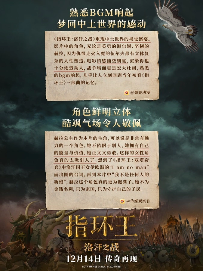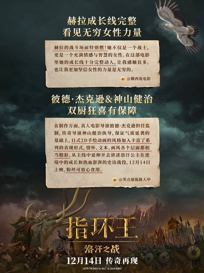《指环王:洛汗之战》由华纳兄弟影片公司出品,12月14日全国上映。影片正在火热预售中,岁末压轴巨制荣耀登场,邀你重返中土世界!![]()