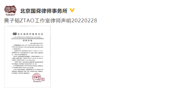28日,北京国舜律师事务所发布黄子韬工作室律师声明,声明中称近期网络上出现了大规模针对我方艺人黄子韬先生的大量不实信息,已严重影响到艺人的形象和声誉,声明要求相关网络用户、自媒体等立刻停止恶意揣测与传播,并删除相关不实信息及误导性言论。